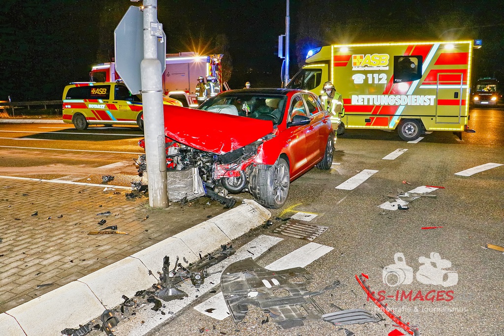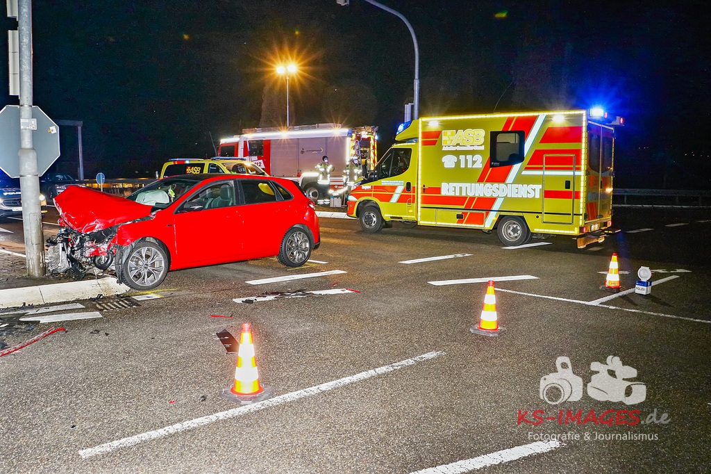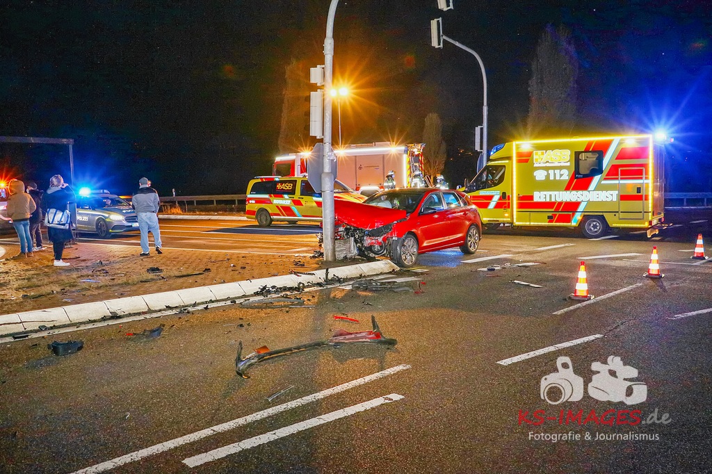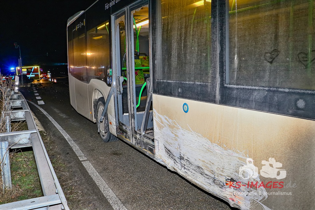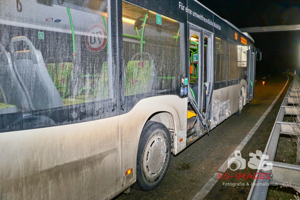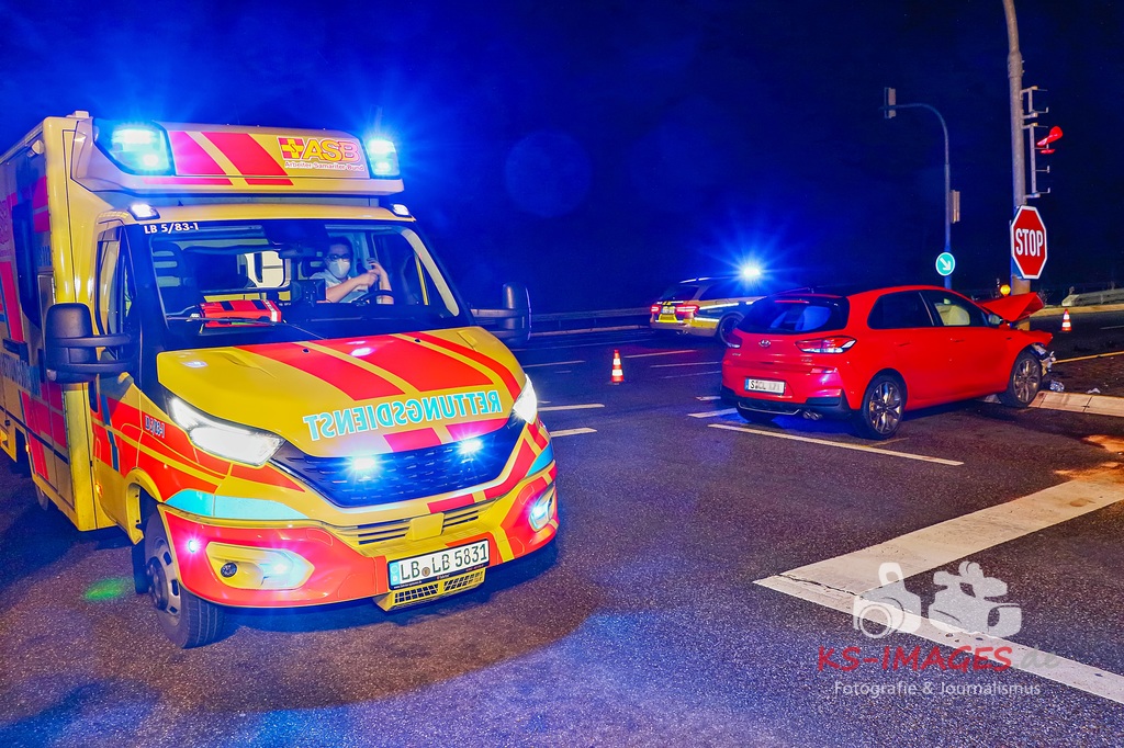 Der 57-jährige Busfahrer sowie die vier Businsassen blieben unverletzt, wohingegen die 27-jährige Unfallverursacherin durch die Kollision leicht verletzt wurde und durch die Rettungskräfte vor Ort in ein umliegendes Krankenhaus verbracht wurde. Die Feuerwehr Schwieberdingen, welche mit drei Fahrzeugen und 16 Einsatzkräften vor Ort war, übernahm zusammen mit der Straßenmeisterei Ludwigsburg die erforderliche Fahrbahnreinigung aufgrund ausgelaufener Betriebsstoffe. Um die Funktionsfähigkeit der Lichtzeichenanlage wiederherzustellen, wurde ein Techniker hinzugerufen, welcher diese wieder bereits während der Unfallaufnahme herstellte. Für die Unfallaufnahme waren zwei Streifenwagenbesatzungen des Polizeireviers Ditzingen eingesetzt. Fotos: Andreas Rometsch Text: Polizeipräsidium Ludwigsburg.