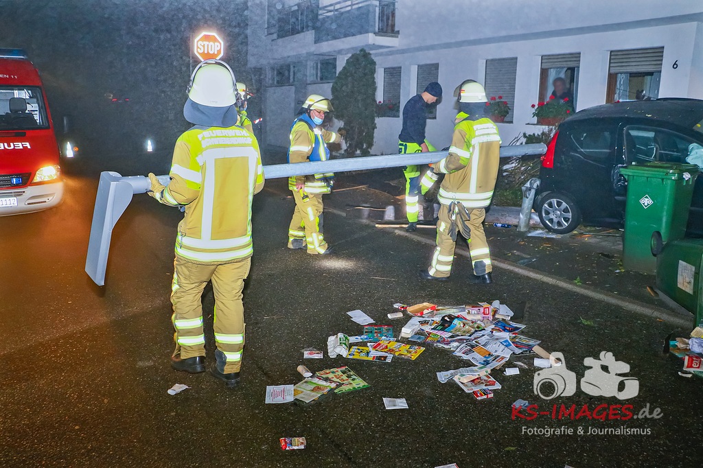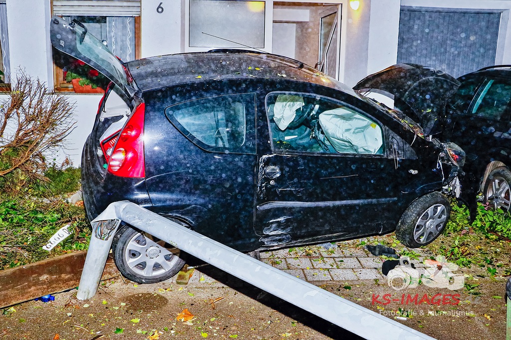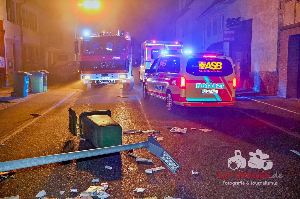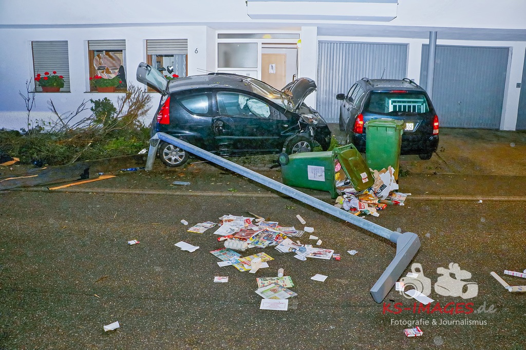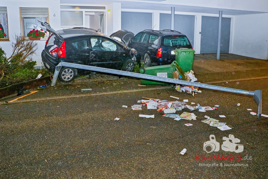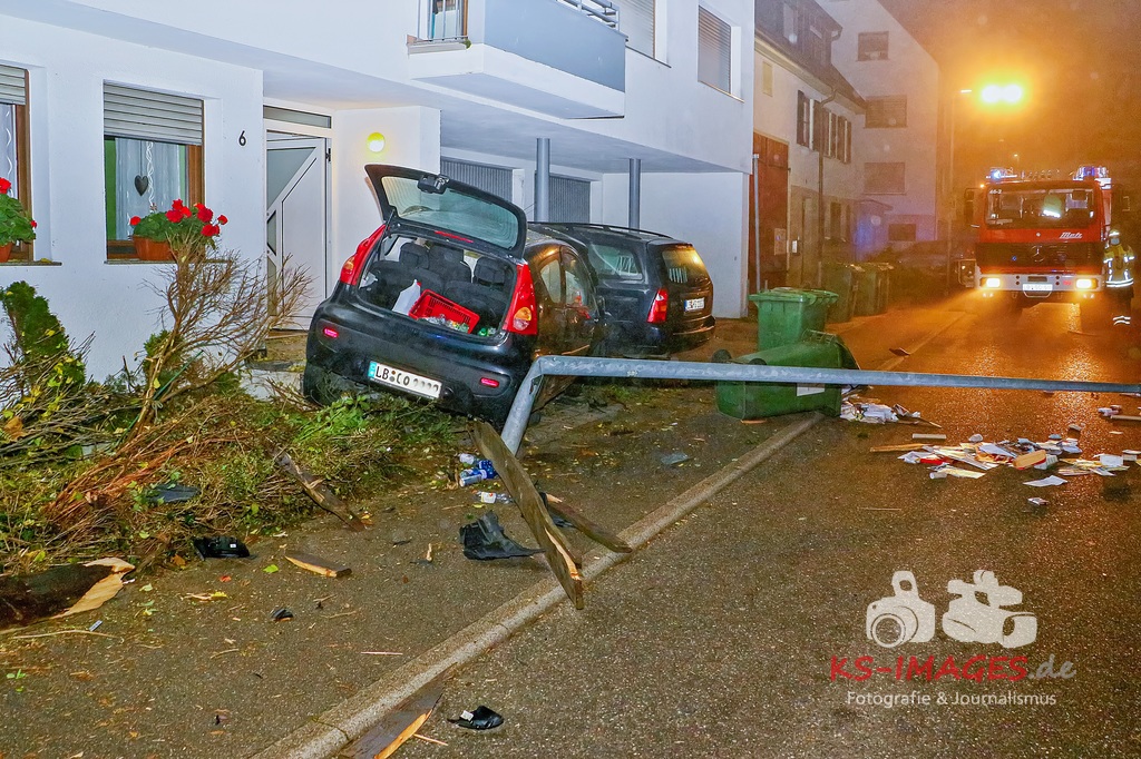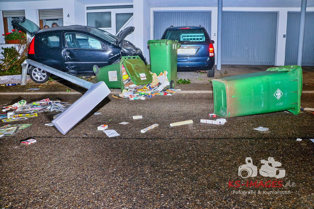 0 SCHWIEBERDINGEN: Schwere Verletzungen zog sich die 22-jähirge Fahrerin eines Peugeot am frühen Freitagmorgen gegen 00:40 Uhr zu, als sie vermutlich aufgrund einer medizinischen Ursache in der Ludwigsburger Straße in Schwieberdingen die Kontrolle über ihr Fahrzeug verlor und im weiteren Verlauf mehrere Mülltonnen, ein Verkehrszeichen einen Zaun, eine Straßenlaterne sowie einen geparkten Ford beschädigte, bevor sie auf dem Treppenaufgang eines Wohnhauses zum Stillstand kam.