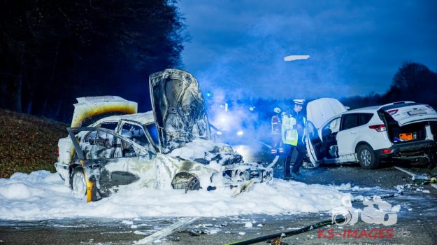 L1115 GROßBOTTWAR: Aus bislang ungeklärter Ursache geriet kurz vor 16.00 Uhr ein 37-jährige Fahrer mit seinem BMW auf der Landesstraße 1115, nach der Autobahnanschlussstelle Mundelsheim in Fahrtrichtung Backnang, nach links auf die Gegenfahrbahn und kollidierte hier mit einem 48-jährigen Ford Kuga Fahrer. Nach der Kollision fing der BMW Feuer und der 37-Jährige konnte durch Verkehrsteilnehmer schwer verletzt noch rechtzeitig aus seinem Fahrzeug gerettet werden.