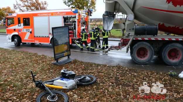 STUTTGART-WEILIMDORF: Ein 40 Jahre alter E-Bike-Fahrer ist am Donnerstagmorgen (04.11.2021) bei einem Verkehrsunfall in der Flachter Straße tödlich verletzt worden. Ersten Ermittlungen zufolge, befuhr ein 41-jähriger Fahrer eines Betonmischers gegen 07.00 Uhr die Flachter Straße in Richtung Bundesstraße 295.