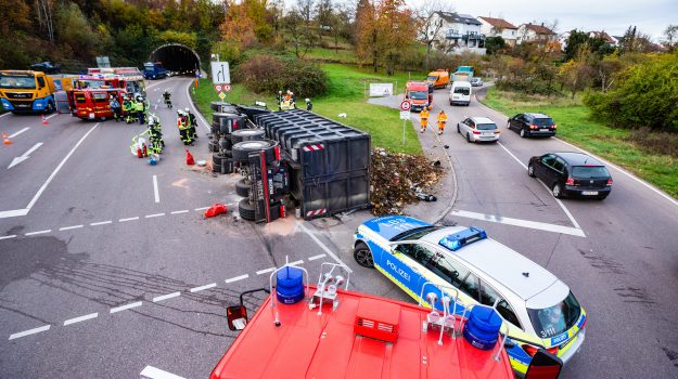 MURR: Beim Einfahren von der L 1100 in die L 1125 in Richtung Murr ist am Donnerstag gegen 15:00 Uhr ein mit Biomüll beladener Lkw samt Anhänger mit einem Gesamtgewicht von über 40 Tonnen umgekippt. Dabei wurde auch die dortige Ampelanlage stark beschädigt. Der 35-jährige Fahrer des Lkw zog sich mutmaßlich leichtere Verletzungen zu und wurde vom Rettungsdienst ins Krankenhaus gebracht. Die Fahrerin eines nachfolgenden Pkw verletzte sich leicht an Glasscherben.