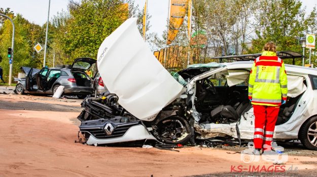 0 KORNWESTHEIM: Bei der Einsatzfahrt eines zivilen Dienstfahrzeugs der Polizei zur Festnahme eines mit Haftbefehl gesuchten Straftäters hat sich am Donnerstag gegen 10:15 Uhr auf der L 1144/Aldinger Straße in Kornwestheim ein schwerer Verkehrsunfall ereignet. Der Fahrer des Einsatzfahrzeugs war mit seiner Kollegin in Richtung Remseck unterwegs und stieß dabei mit seinem Mercedes mit dem Renault eines 54-jährigen zusammen, der an der ampelgeregelten Einmündung der Straße „Im Haldenrain“ auf die Landesstraße einfahren wollte. Durch die Wucht des Aufpralls wurde der Mercedes nach links abgewiesen und streifte einen entgegenkommenden BMW und einen nachfolgenden Mercedes A-Klasse.