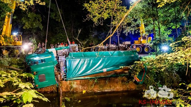 0 KIRCHBERG AN DER MURR: Am Montag, gegen 18:00 Uhr, kam es auf der Kreisstraße 1834 zwischen Kirchberg/Murr und Steinheim/Murr zwischen einem 52-jährigen Sattelzuglenker und einem 32-jährigen Skodafahrer zu einem Zusammenstoß im Begegnungsverkehr. Durch die Wucht des Aufpralls verklemmte sich das linke Vorderrad des mit Split voll beladenen, 40 Tonnen schweren Sattelzuges wodurch er nahezu manövrierunfähig wurde. Der Lkw kollidierte mit der Leitplanke, drückte sie um und kippte anschließend in die neben der Straße verlaufende Murr. Der Skodafahrer wurde durch den Unfall leicht verletzt und musste in ein nahegelegenes Krankenhaus verbracht werden. Der Lkw-Fahrer konnte sich aus dem Führerhaus über die Beifahrerseite selbst befreien und blieb unverletzt. Die Feuerwehren Kirchberg/Murr, Erdmannhausen sowie der Gefahrgutzug aus Winnenden waren mit insgesamt 12 Fahrzeugen und 59 Mann im Einsatz. Zwei Ölsperren wurden auf der Murr wegen ausgelaufenem Öl errichtet. Zur Bergung des Sattelzuges rückte ein Bergungsunternehmen aus Waiblingen mit zwei Kränen an. Des Weiteren waren die Straßenmeisterei Backnang, der DRK-Ortsverband Kirchberg, ein Rettungswagen und das Landratsamt Rems-Murr-Kreis im Einsatz. An der Leitplanke, den Fahrzeugen und der Flur entstand Sachschaden in Höhe von ca. 190.000 Euro. Die Kreisstraße war für die Bergungsarbeiten bis ca. 02:30 Uhr in beide Richtungen gesperrt.