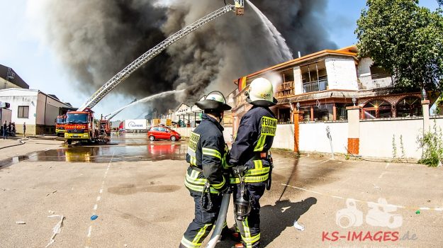 REMSECK: Am Freitag gegen 09.00 Uhr brach in einer Kraftfahrzeughalle eines Fahrzeugverwerters im Bernhardslaicherweg im Gewerbegebiet in Aldingen aus noch unbekannter Ursache ein Feuer aus. Die Flammen breiteten sich auf die gesamte Halle aus. Es befanden sich etwa 100 für die Verwertung vorgesehen Fahrzeuge darin. Auf ein angrenzendes Bürogebäude, das zur betreffenden Firma gehört, griff das Feuer schließlich über. Einen Übergriff auf benachbarte Gebäude konnte die Feuerwehr, die einen massiven Löschangriff durchführt, verhindern. Es sind derzeit Feuerwehren aus dem Landkreis Ludwigsburg, dem Rems-Murr-Kreis und Stuttgart mit über 200 Kräften im Einsatz. Die Einsatzleitung hat der Kommandant der Freiwilligen Feuerwehr Remseck am Neckar, Michael Leutenecker, inne. Darüber hinaus befinden sich der Kreisbrandmeister Andy Dorroch sowie der Leitende Notarzt Dr. Weiß vor Ort. Remsecks Oberbürgermeister Dirk Schönberger machte sich persönlich ein Bild vom Brandort und war erleichtert und froh, dass keine Personen zu Schaden kamen. Schönberger zeigte sich sehr beeindruckt von der hervorragenden Zusammenarbeit aller Einsatzkräfte, auch über die Kreisgrenzen hinaus. „Es ist keine Selbstverständlichkeit, dass Hubschrauber aus zwei Blaulichtorganisationen * in Remseck sind.“ (*Anmerk.: Rettungshubschrauber und Polizeihubschrauber). Die Feuerwehr führt permanent Schadstoffmessungen durch. Diese Messungen begründen keinen Anlass zur Sorge. Vorsorglich bitten wir im Umkreis von fünf Kilometern um das Industriegebiet Aldingen Türen und Fenster geschlossen zu halten und Klimaanlagen auszuschalten. Der Einsatz der Feuerwehr dauert derzeit an.