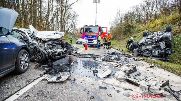 MURR AN DER MURR: Zwei Schwerverletzte und Sachschaden von etwa 170.000 Euro forderte ein Verkehrsunfall, der sich am Donnerstag, gegen 14:50 Uhr, auf der Landesstraße 1100 ereignete. Ein 74 Jahre alter Porsche-Lenker, der in Richtung Steinheim an der Murr unterwegs war, geriet zwischen dem Bergkelter-Tunnel und dem Steinbruch- Tunnel aus noch ungeklärter Ursache auf die linke Fahrbahnseite. Dort stieß er mit einem entgegenkommenden Opel zusammen, an dessen Steuer ein 63-Jähriger saß. Durch den starken Aufprall überschlug sich der Porsche, kam nach links von der Fahrbahn ab und blieb in einer Böschung auf dem Dach liegen. Der Opel kam zu diesem Zeitpunkt quer auf der Fahrbahn zum Stehen. Eine nachfolgende 41-jährige VW-Lenkerin konnte nicht mehr rechtzeitig anhalten und fuhr seitlich in den Opel. Ein weiterer VW, der hinter dem Porsche fuhr, wurde noch durch Trümmerteile beschädigt. Die beiden Fahrer im Porsche und im Opel erlitten durch den Zusammenstoß schwere Verletzungen. Sie wurden mit dem Rettungsdienst in ein Krankenhaus gebracht. Die beiden Fahrzeuge der Schwerverletzten waren nicht mehr fahrbereit und mussten abgeschleppt werden. Die Freiwilligen Feuerwehren Murr und Pleidelsheim waren mit insgesamt 22 Wehrleuten und 3 Fahrzeugen an der Unfallstelle im Einsatz. Darüber hinaus kümmerten sich zwei Notärzte um die beiden Verletzten. Derzeit (16:50 Uhr) ist die Landesstraße 1100 im Bereich der Unfallstelle voll gesperrt. Die Bergungsarbeiten dauern noch an. Eine örtliche Umleitung ist eingerichtet.