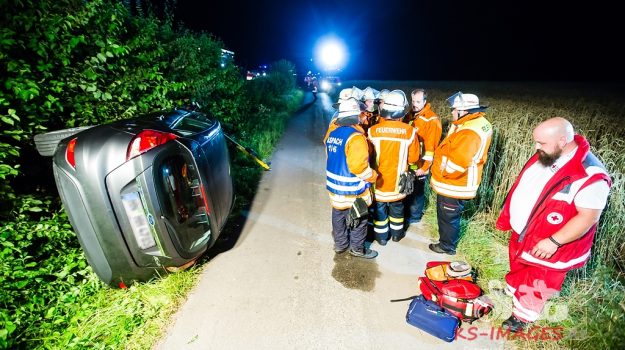 ASPACH: Das Unheilig Konzert ist gerade zu Ende, unweit von der Mechatronik Arena auf der L1115 bei Aspach passiert es. Ein älterer Fahrzeuglenker erleidet während der Fahrt einen medizinischen Notfall. Das Fahrzeug kam von der Straße ab, fuhr eine Böschung hinab und blieb auf der Seite liegen. Notrufe gehen ein. Glück für den Verunglückten der Ortsverein des DRK (Aspach) war noch in der Mechatronik Arena welche zur Absicherung des Konzertes war. Sofort eilte ein Fahrzeug mit Blaulicht zum Unfall welches eine Anfahrt von wenige Minuten hatte. Schnell stellten die Ersthelfer des DRK´s fest, Kreislaufstillstand. Sofort wird die Reanimation eingeleitet. Bei einem Kreislaufstillstand wird nach ungefähr drei Minuten das Gehirn nicht mehr genügend mit Sauerstoff versorgt, sodass dort irreversible Schäden auftreten. Die Kurze Anfahrt rettete vermutlich dem Herrn das Leben. Als Notarzt und Rettungsdienst eintrafen ist die Reanimation noch am laufen, die sofortige medezinische Versorgung auch mit Hilfe eines Defibrilators rettete die Person.