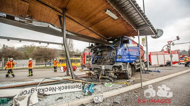 0 REMSECK: Zwei Leichtverletzte und ein Sachschaden von etwa 250.000 Euro forderte ein Verkehrsunfall, der sich am Mittwoch, gegen 08:25 Uhr, „Im Pflädle“ in Remseck am Neckar ereignete. Ein 37-jähriger Lkw-Fahrer war auf der Landesstraße 1100 aus Stuttgart kommend in Richtung Remseck unterwegs und kam im Bereich der S-Bahn Endhaltestelle vor der Kreuzung zur Meslay-Du-Maine-Straße aus bislang unbekannter Ursache nach links von der Fahrbahn ab. Er streifte ein Verkehrszeichen und überfuhr einen Fahrbahnteiler. Anschließend fuhr der Lkw nach rechts über mehrere Fahrstreifen und stieß in der Folge mit einem VW Golf zusammen, dessen 85-jährige Fahrerin verkehrsbedingt an einer Ampel angehalten hatte. Durch den Aufprall schleuderte der VW nach links und kam auf einer Verkehrsinsel zum Stehen. Der Lkw wurde im weiteren Verlauf nach rechts abgewiesen, überfuhr eine Grünfläche und prallte letztendlich frontal gegen eine Bushaltestelle. Durch den Aufprall stürzte die Überdachung der Bussteiges teilweise ein und blieb auf dem LKW-Führerhaus liegen. Der 37-Jährige wurde in seinem Lkw eingeklemmt und musste durch die Feuerwehr mit Hilfe eines hydraulischen Rettungsgeräts befreit werden. Die 85-Jährige und der LKW-Fahrer zogen sich leichte Verletzungen zu und wurden vom Rettungsdienst in ein Krankenhaus gebracht. Nach bisherigen Erkenntnissen befand sich zur Unfallzeit eine bislang unbekannte Person an der Bushaltestelle, die sich nur noch durch einen Sprung zur Seite retten konnte. Nachdem die unbekannte Person beim Eintreffen der Polizei nicht mehr vor Ort war, wird diese dringend gebeten, sich bei der Verkehrspolizeidirektion Ludwigsburg, Tel.: 0711/6869-0, zu melden. An der Unfallstelle waren die Freiwilligen Feuerwehren Remseck und Kornwestheim sowie die Berufsfeuerwehr Stuttgart eingesetzt, die mit insgesamt 47 Wehrleuten und 14 Fahrzeugen vor Ort waren. Zur Versorgung der Verletzten waren zwei Rettungsfahrzeuge und ein Notarztwagen im Einsatz.