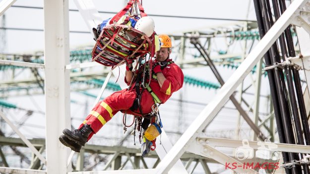 Herr Bläse von der Feuerwehr Ludwigsburg hatte sich zusammen mit der Firma Amprion ein Übung Szenarium auserarbeitet. Es sollte hier die Zusammenarbeit mit der Höhenrettungsgruppe aus Stuttgart geübt werden.