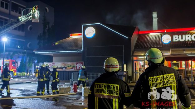 Ludwigsburg: Brand in Schnellrestaurant – Ludwigsburg: Am Montagabend um 21:36 Uhr ging bei der Polizei ein Notruf aus einem Schnellrestaurant in der Schwieberdinger Straße in Ludwigsburg wegen eines Brandes ein. Bei Eintreffen der Einsatzkräfte konnte schnell festgestellt werden, dass alle Personen das Gebäude sicher verlassen hatten. Wegen einer starken Rauchentwicklung und dem Einsatz der Feuerwehr musste die Schwieberdinger Straße bis zum Abschluss der Löscharbeiten gesperrt werden. Da der Abluftkamin aus dem Küchenbereich durch brennendes Fett stark erhitzt wurde, schlugen zeitweise Flammen aus dem Gebäudedach. Gegen 22:10 Uhr hatte die Feuerwehr das Feuer gelöscht. Wodurch das Fett in Brand geraten war, ist bislang unklar. Nach ersten Schätzungen entstand am Gebäude Sachschaden in Höhe von etwa 40.000 Euro. Personen kamen nicht zu Schaden. Die Feuerwehr war mit zehn Fahrzeugen und 51 Feuerwehrleuten im Einsatz. Der Rettungsdienst war mit insgesamt 15 Einsatzkräften, darunter zwei Rettungswagenbesatzungen und einer Notärztin vor Ort. Das Polizeirevier Ludwigsburg hatte vier Streifenbesatzungen im Einsatz. Zeitweise hielten sich bis zu 100 Schaulustige nahe dem Brandort auf, die aber den Aufforderungen der Polizei im Wesentlichen Folge leisteten und ausreichend Abstand hielten.