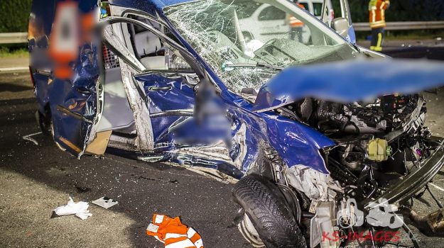 LUDWIGSBURG: Zwei schwer verletzte Personen und ein Sachschaden über etwa 33.000 Euro sind die Bilanz eines Unfalls, der sich am Dienstag gegen 21.45 Uhr zwischen den Anschlussstellen Mundelsheim und Pleidelsheim in Fahrtrichtung Stuttgart ereignete. Mutmaßlich war ein 35-jähriger Kleintransporter-Fahrer aufgrund einer Müdigkeitsattacke kurz eingenickt und trat wohl beim Aufwachen voll auf die Bremse, worauf er die Kontrolle über seinen VW Caddy verlor. Das Fahrzeug schleuderte daraufhin nach rechts, kollidierte mit der Schutzplanke und blieb schlussendlich quer auf dem mittleren der drei Fahrstreifen stehen. Ein von hinten herannahender 29 Jahre alter Audi-Lenker, der vermutlich zu schnell unterwegs war, erkannte den Unfall zu spät und fuhr frontal in die Seite des VW. Durch die Wucht des Aufpralls wurde dieser etwa 50 Meter nach vorne katapultiert und sogar der Motorblock aus dem Transporter geschleudert. Der Audi kam im weiteren Verlauf nach rechts von der Fahrbahn ab und stieß im Bereich des Standstreifens mit einem VW Passat zusammen. Dessen 60-jähriger Lenker hatte anhalten wollen, um erste Hilfemaßnahmen für den Fahrer des Kleintransportes einzuleiten. Der Wagen des 29-Jährigen wurde anschließend nach links abgewiesen und prallte in die Mittelleitplanke, wo der PKW zum Stehen kam. Der Lenker des VW Caddy und auch der Fahrer des Audi erlitten schwere Verletzungen. Sie mussten mit Rettungswagen in Krankenhäuser eingeliefert werden. Während der Unfallaufnahme war die komplette Fahrbahn bis gegen 03.00 Uhr gesperrt. Zum Ausleuchten der Unfallstelle und zur Beseitigung ausgelaufener Betriebsstoffe waren insgesamt 51 Einsatzkräfte der Freiwilligen Feuerwehren Mundelsheim, Großbottwar und Besigheim, die mit acht Fahrzeugen ausrückten, eingesetzt. Die drei unfallbeteiligten Fahrzeuge waren nicht mehr fahrbereit und wurden abgeschleppt.