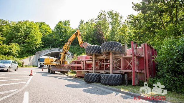 Besigheim: Mehrere Tonnen Rindenmulch wurden am Donnerstag im Grünstreifen der Straße „Auf dem Kies“ verteilt, als ein 20-Jähriger gegen 14.50 Uhr mit seinem Traktor plus Anhänger unterwegs war. Während der junge Fahrer aus Richtung Oststraße heranfuhr, kippte sein Anhänger, der mit 16 Tonnen Rindenmulch beladen war, beim Abbiegen nach links auf die Bundesstraße 27 um. Vermutlich hatte er den hohen Schwerpunkt der Ladung beim Einfahren in den Kreuzungsbereich in der Kurve falsch eingeschätzt. Der umgekippte Anhänger beschädigte einen Videomast sowie zwei Schaltkästen. Der entstandene Sachschaden dürfte sich auf etwa 15.000 Euro belaufen. Zur Bergung des Rindenmulchs und des Anhängers musste ein Bagger angefordert werden. Für die Dauer der Bergungsarbeiten wurde die Straße teilweise gesperrt.