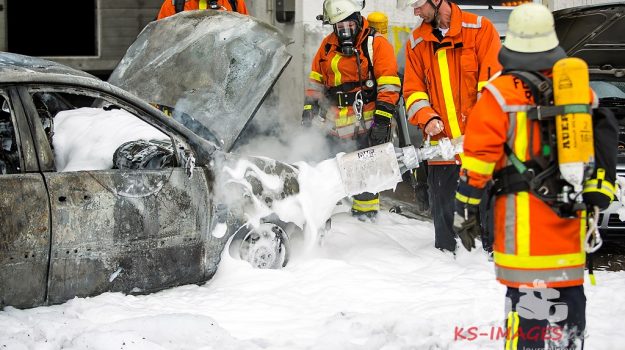 Remseck-Aldingen: Am Samstag, kurz nach 19.00 Uhr, geriet ein auf einem Firmengelände im Bernhardslaicher Weg abgestellter alter VW vermutlich aufgrund eines technischen Defekts in Brand und brannte vollständig aus. Ein daneben zur Verschrottung bereitgestellter weiterer alter VW wurde ebenfalls in Mitleidenschaft gezogen. An beiden Fahrzeugen entstand insgesamt ein Schaden von etwa 600 Euro. Die Feuerwehr Remseck war mit 5 Fahrzeugen und 30 Mann im Einsatz.