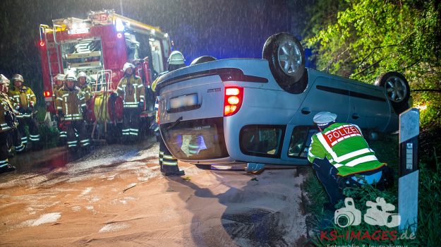 SCHWIEBERDINGEN: Am Freitag um 21:45 Uhr befuhr ein 45jähriger Fahrzeuglenker mit seinem Pkw Renault die Hemminger Straße ortsauswärts in Richtung Hemmingen. Im Verlauf einer Linkskurve kam er auf regennasser Fahrbahn offenbar aufgrund unangepasster Geschwindigkeit nach rechts von der Fahrbahn ab, überfuhr mehrere Leitpfosten und Warnbaken, kollidierte mit einem Baum und überschlug sich letztendlich an einer Böschung. Ersthelfer vor Ort befreiten den leicht verletzten Fahrzeuglenker aus dem auf dem Dach liegenden Pkw. Er wurde im weiteren Verlauf vom Rettungsdienst zur ambulanten Behandlung in das Krankenhaus Ludwigsburg verbracht. Bei der Unfallaufnahme konnte beim Fahrzeuglenker Atemalkoholgeruch festgestellt werden. Ein entsprechender Alkoholvortest bestätigte den Verdacht. Eine Blutentnahme wurde durchgeführt. Am Pkw entstand Totalschaden in Höhe von 2000 Euro. Der Sachschaden an den Verkehrszeichen und am Baum wird auf insgesamt 400 Euro geschätzt. Aufgrund ausgelaufener Betriebsstoffe und Absperrmaßnahmen war die freiwillige Feuerwehr Schwieberdingen mit insgesamt 4 Fahrzeugen und 27 Einsatzkräften vor Ort.