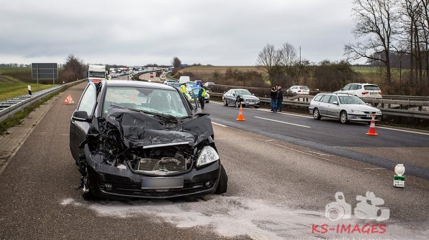 Fünf leicht verletzte Beteiligte und einen Sachschaden in Höhe von 50.000 Euro forderte ein Verkehrsunfall, der sich am Mittwoch gegen 09.45 Uhr zwischen den Anschlussstellen Mundelsheim und Pleidelsheim ereignet hat. Der 32-jährige Fahrer eines Sattelzuges war in Richtung Stuttgart auf dem rechten Fahrstreifen unterwegs und wollte einen vor sich fahrenden Lkw überholen. Hierzu wechselte er auf den mittleren Fahrstreifen und übersah dabei vermutlich den von hinten herannahenden Daimler-Benz A-Klasse, an dessen Steuer ein 23-Jähriger saß. Um einen Zusammenstoß zu verhindern, musste der 23-Jährige nach links ausweichen. Dabei prallte er gegen den Daimler-Benz C-Klasse einer ebenfalls 23-Jährigen, die auf dem linken Fahrstreifen fuhr. Durch den Aufprall schleuderte die A-Klasse nach rechts und stieß mit dem Sattelzug zusammen. Umherfliegende Teile beschädigten einen nachfolgender Peugeot, den eine 42-Jährige lenkte. Bei dem Unfall wurden der Fahrer der A-Klasse sowie seine Beifahrerin verletzt und mussten mit dem Rettungsdienst in ein Krankenhaus gebracht werden. Auch der Fahrer der C-Klasse sowie seine beiden Mitfahrer trugen Verletzungen davon. Beide Daimler-Benz waren nicht mehr fahrbereit und wurden abgeschleppt. Für die Dauer der Unfallaufnahme musste die Autobahn knapp eine Stunde voll gesperrt werden. Nachdem der Verkehr zunächst einspurig wieder fahren konnte, wurde die Fahrbahn nach etwa einer weiteren Stunde wieder komplett frei gegeben. Um die Fahrbahn zu reinigen war die Feuerwehr Mundelsheim mit einem Fahrzeug und sieben Mann im Einsatz.