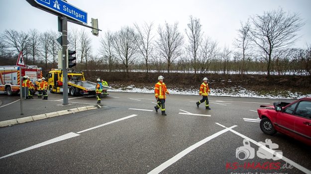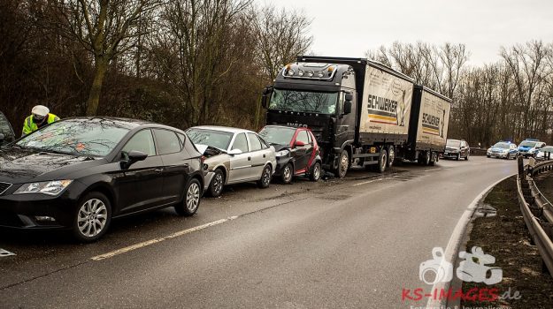 Zwei Leichtverletzte und rund 23.000 Euro Sachschaden forderte am Montag, gegen 11:15 Uhr, ein Verkehrsunfall auf der L 1140 zwischen Möglingen und Ludwigsburg. Der 58-jährige Fahrer eines Lkw war von der Autobahn-Anschlussstelle kommend in Richtung Ludwigsburg unterwegs und hatte im Verlauf einer Linkskurve zu spät bemerkt, dass vorausfahrende Autofahrer aufgrund eines Pannenfahrzeugs abgebremst hatten. Er schon drei Pkw aufeinander, die dadurch stark beschädigt wurden und abgeschleppt werden mussten. Zwei Frauen zogen sich leichte Verletzungen zu und wurden vom Rettungsdienst vorsorglich zur Untersuchung ins Krankenhaus gebracht. Die Fahrbahn musste durch Mitarbeiter der Technischen Dienste Ludwigsburg und Einsatzkräfte der Freiwilligen Feuerwehr gereinigt werden.