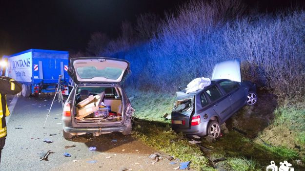 alte Lenkerin eines Fiat war in Fahrtrichtung Würzburg unterwegs, als sie wegen einer Panne auf dem Seitenstreifen anhalten musste. Ein 50 Jahre alter Lenker eines Opel bemerkte dies und hielt vor dem Fiat an, um zu helfen. Der auf der rechten Fahrspur fahrende 42 Jahre alte Lenker eines Lkw übersah die Pannenstelle vermutlich, kam aus bislang ungeklärter Ursache nach rechts von der Fahrbahn ab, kollidierte mit dem Fiat und schob ihn auf den davor stehenden Opel, der noch nach rechts in die Böschung abgewiesen wurde. Durch die Wucht des Aufpralls kam der Lkw erst einige Meter weiter zum Stehen und nahezu seine komplette Ladung an Getränkekisten verteilte sich auf der Fahrbahn. Der rechte und mittlere Fahrstreifen mussten für die Zeit der Unfallaufnahme gesperrt werden. Der Fahrer des Lkw und der Opel-Fahrer wurden leicht verletzt. Die Fiat-Fahrerin und ihr 14-jähriger Sohn mussten mit schweren Verletzungen vom Rettungsdienst in ein Krankenhaus gebracht werden, während der fünfjährige Sohn glücklicherweise mit leichten Verletzungen davonkam. Alle unfallbeteiligten Fahrzeuge waren nicht mehr fahrbereit und wurden abgeschleppt. Bedingt durch die zeitaufwändigen Bergungs- und Reinigungsarbeiten entwickelte sich im morgendlichen Berufsverkehr ein Stau von bis zu 16 Kilometern Länge. Nachdem der Verkehr ab 08:30 Uhr wieder auf zwei Fahrstreifen an der Unfallstelle vorbeigeleitet werden konnte, war die Fahrbahn gegen 11:00 Uhr wieder vollständig frei. Der Gesamtschaden wurde mit etwa 65.000 Euro angegeben. Der Rettungsdienst war mit drei Fahrzeugen, zwei Notärzten und zehn Sanitätern vor Ort. Auch die Feuerwehren Pleidelsheim und Marbach waren mit sechs Einsatzfahrzeugen und 31 Wehrleuten im Einsatz.
