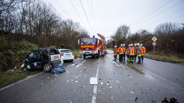 die K 1692 bei Remseck-Aldingen. Der 46-jährige Fahrer eines Smart war gegen 08:20 Uhr auf der Landesstraße von Kornwestheim in Richtung Aldingen unterwegs und an der Einmündung vermutlich infolge nicht angepasster Geschwindigkeit beim Abbremsen auf die Kreisstraße gerutscht. Hier wurde der Smart vom Mercedes einer 58-jährigen Frau frontal erfasst, die aus Richtung Ludwigsburg kommend herangefahren war. Während der 46-Jährige in seinem Fahrzeug eingeklemmt und von der Feuerwehr schwer verletzt geborgen wurde, kam die 58-Jährige mit leichten Verletzungen davon. Neben 25 Einsatzkräften der Freiwilligen Feuerwehr Remseck waren zwei Fahrzeugbesatzungen des Rettungsdienstes und ein Notarzt am Unfallort. Zeugen des Verkehrsunfalls und insbesondere Verkehrsteilnehmer, die Angaben zum vorangegangenen Fahrverhalten des Smart-Fahrers machen können, werden gebeten, sich mit dem Unfallaufnahmedienst der Verkehrspolizei, Tel. 07156/4350-0, in Verbindung zu setzen. (Quelle: Polizeipräsidium Ludwigsburg)