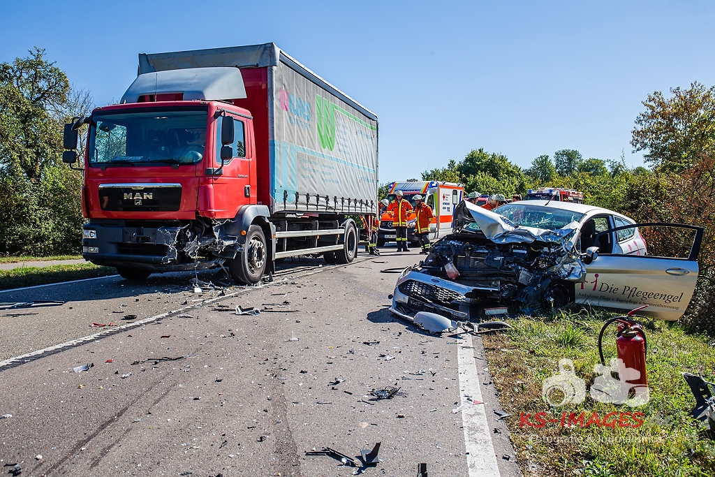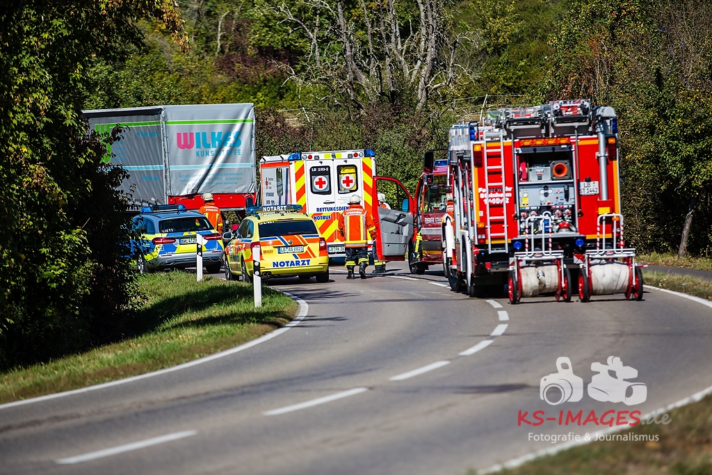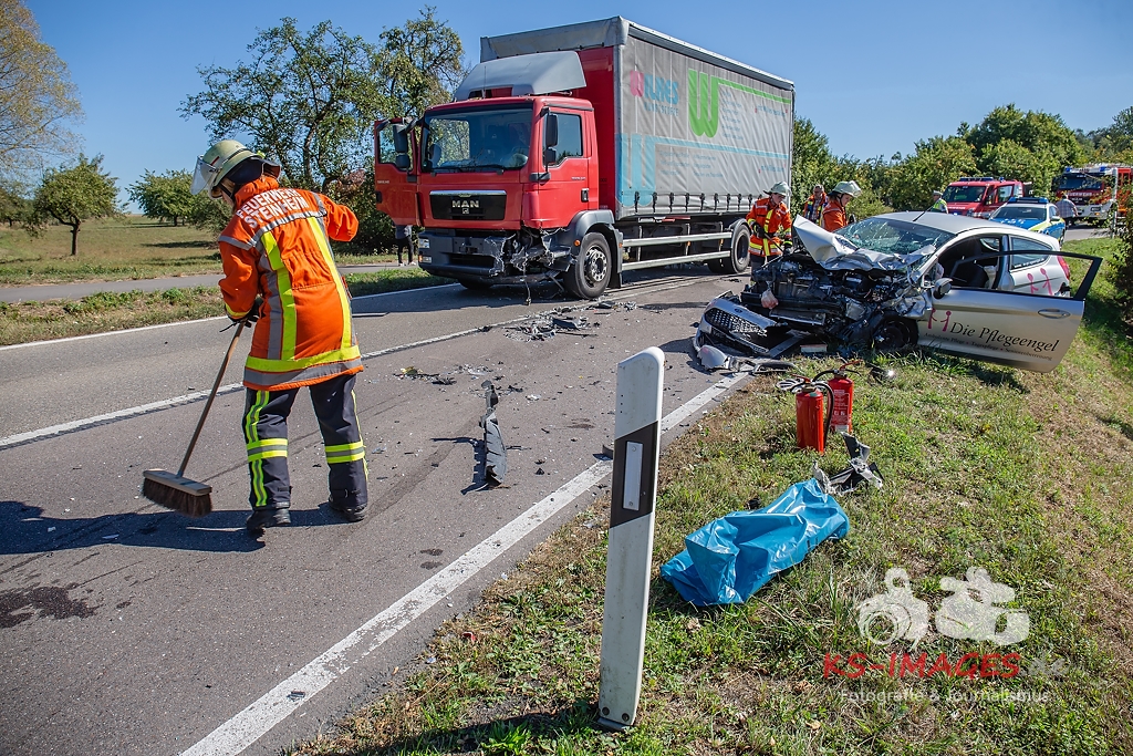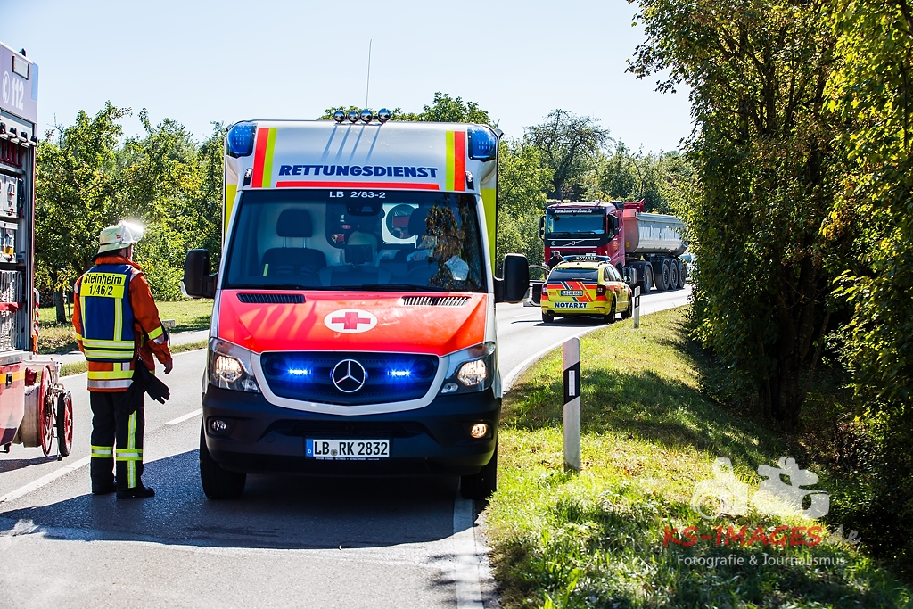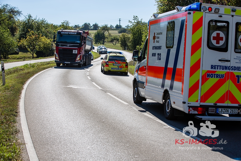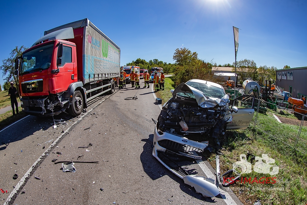 0 STEINHEIM AN DER MURR: Eine 42-Jährige befuhr am Donnerstag gegen 12:25 Uhr mit einem Ford die Kreisstraße 1610 von Höpfigheim in Richtung Steinheim an der Murr. Vermutlich aufgrund von Unachtsamkeit kam die 42-Jährige in einer lang gezogenen Rechtskurve zu weit nach links und stieß mit einem entgegenkommenden Lkw eines 27-Jährigen zusammen. Durch den Zusammenstoß wurde die 42-Jährige leicht verletzt und musste anschließend vom Rettungsdienst in ein Krankenhaus gebracht werden. Der entstandene Sachschaden wurde auf rund 20.000 Euro geschätzt. Im Zuge des Unfalls wurde die Fahrbahn verschmutzt. Alarmierte Kräfte der Freiwilligen Feuerwehr Steinheim, die mit fünf Fahrzeugen und 30 Wehrleuten vor Ort war, kümmerten sich in der Folge um die Fahrbahnreinigung.
