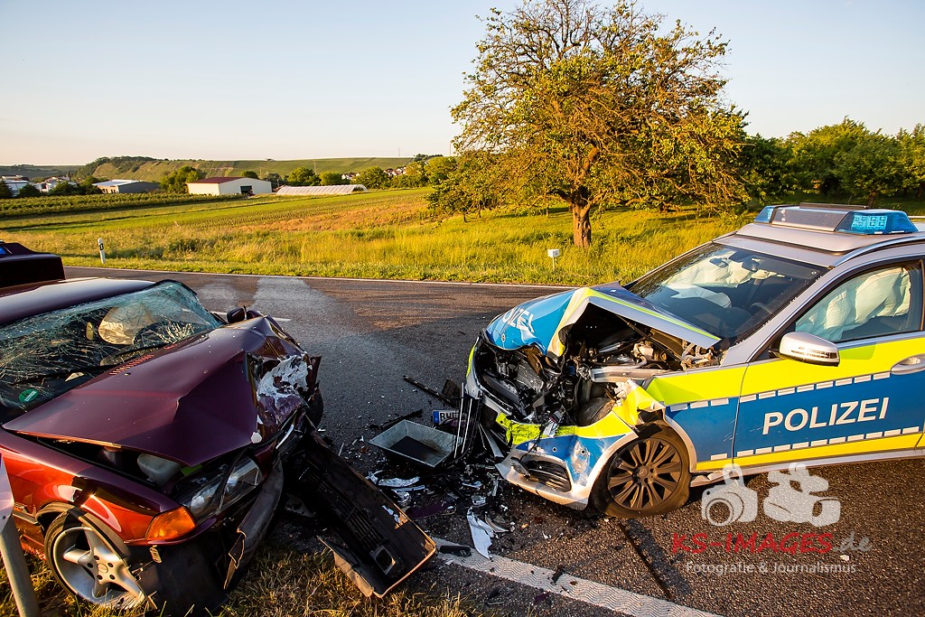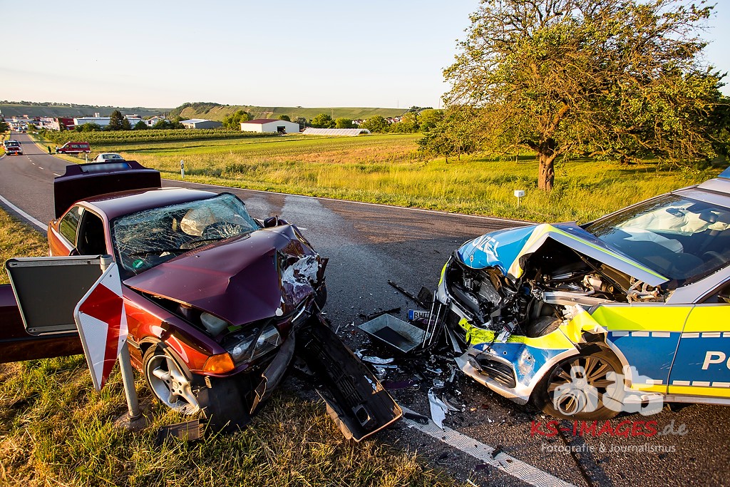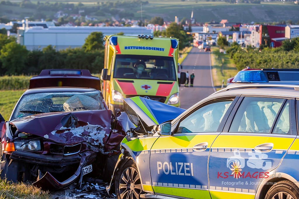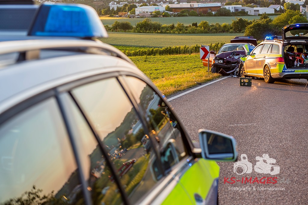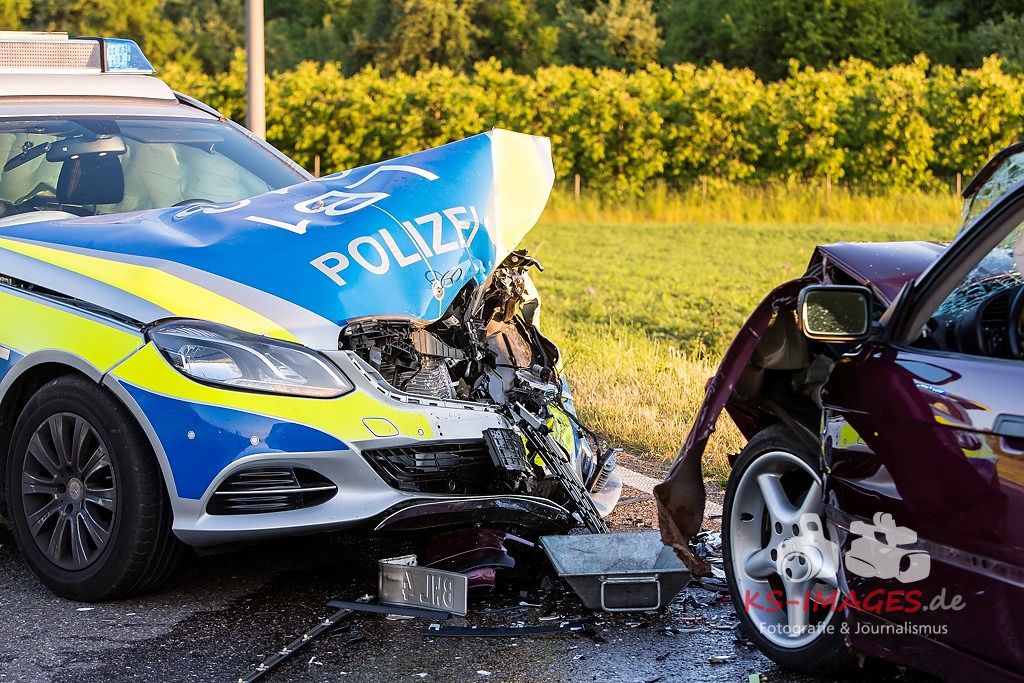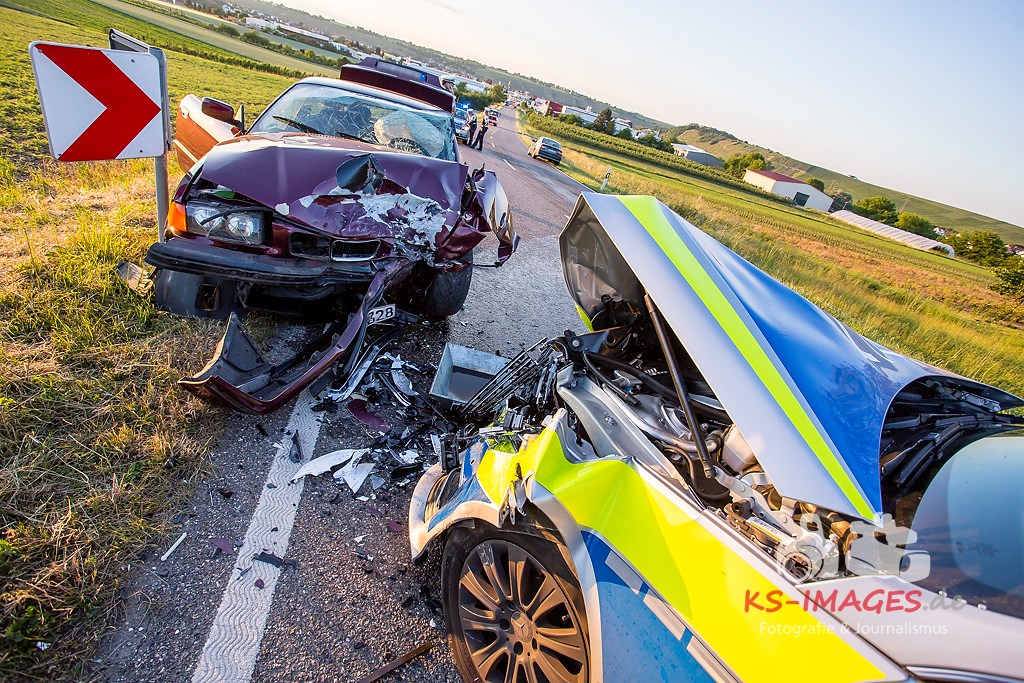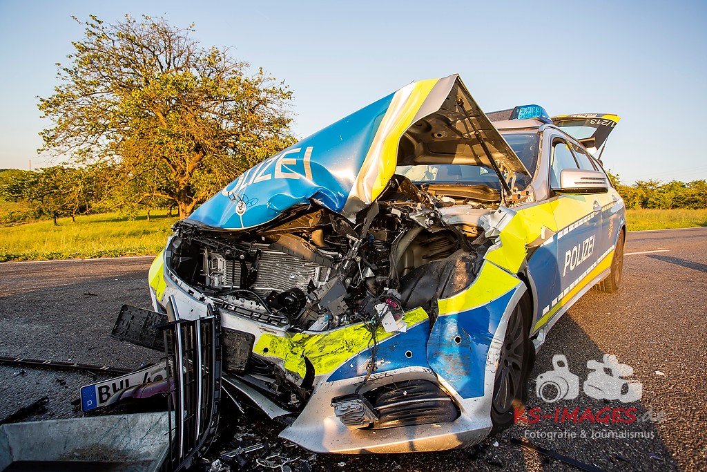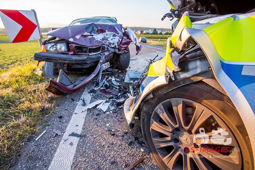0 KIRCHHEIM AM NECKAR: Bei der Anfahrt zu einem Verkehrsunfall mit Personenschaden auf der B27 bei Kirchheim kam es am Mittwochabend zu einem Unfall, an welchem ein Streifenwagen des Polizeirevier Bietigheim beteiligt war. Der Streifenwagen war auf der B27 von Walheim her kommend in Richtung Kirchheim unterwegs und stieß im Begegnungsverkehr mit einem entgegenkommenden BMW zusammen. Bei dem Zusammenstoß wurden die Beifahrerin im Streifenwagen sowie die beiden Insassen des BMW verletzt. Alle wurden mit dem Rettungsdienst in ein Krankenhaus verbracht. Die Polizeibeamtin war leicht verletzt und konnte nach ärztlicher Versorgung ihren Dienst wieder aufnehmen. Der 25-jährige BMW Fahrer erlitt eine Fraktur am Bein und wurde stationär aufgenommen. Der 27-jährige Beifahrer wurde leicht verletzt. Beide Fahrzeuge waren nicht mehr fahrbereit und mussten abgeschleppt werden. Am BMW entstand Totalschaden in Höhe von ca. 5.000 Euro. Der Sachschaden am Streifenwagen beläuft sich auf ca. 65.000 Euro. Für die Dauer der Unfallaufnahme war die B27 zwischen Kirchheim und Walheim von 19:30 bis 22:30 Uhr voll gesperrt.