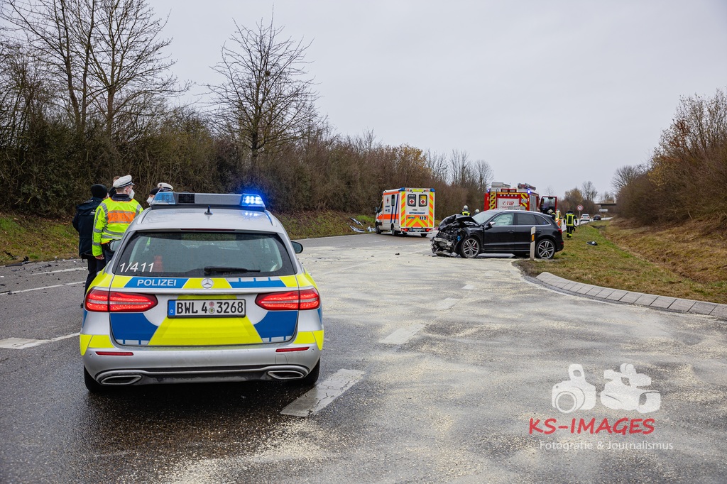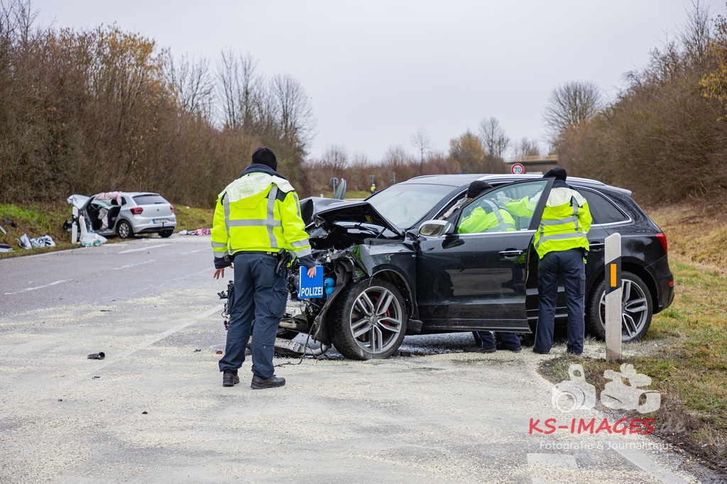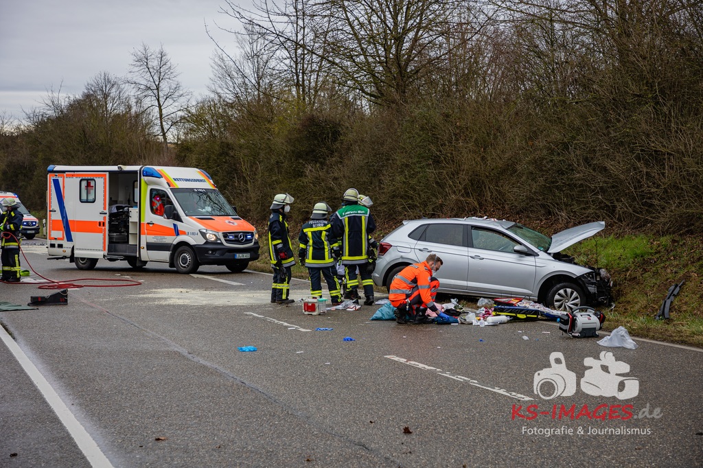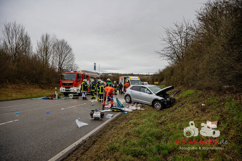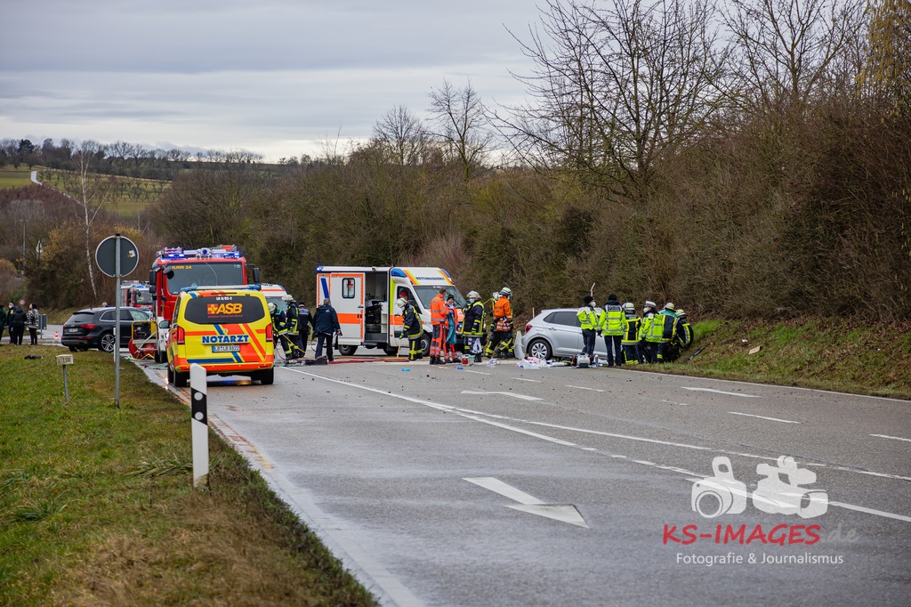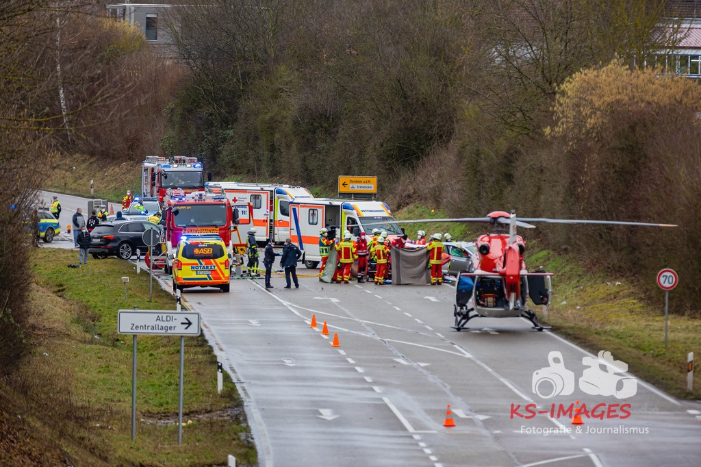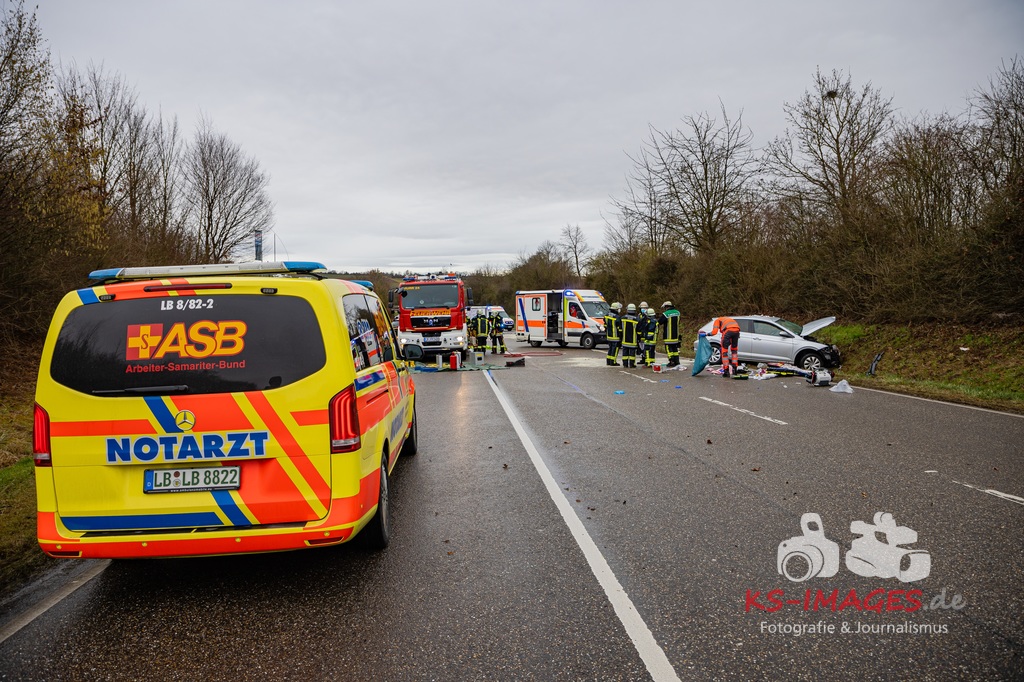 Es kam zur Kollision im Einmündungsbereich. Der 32-Jährige wurde hierbei schwer verletzt und musste mit einem Rettungswagen in ein Krankenhaus gebracht werden. Der 76-jährige VW-Fahrer wurde durch den Unfall ebenfalls schwer verletzt und in seinem Fahrzeug eingeklemmt. Er musste von der Feuerwehr geborgen werden und wurde anschließend in ein Krankenhaus gebracht. Die 74 Jahre alte Beifahrerin im VW wurde an der Unfallstelle von Rettungskräften reanimiert und mit dem Rettungshubschrauber in ein Krankenhaus geflogen. An den Fahrzeugen entstand ein Gesamtschaden in Höhe von rund 25.000 Euro. Die Landesstraße 1100 ist noch bis voraussichtlich 15 Uhr für die Unfallaufnahme und Straßenreinigungsmaßnahmen gesperrt. Zur detaillierten Ermittlung des Unfallhergangs wurde auf Anordnung der Staatsanwaltschaft Heilbronn ein Sachverständiger hinzugezogen und kam an die Unfallörtlichkeit. Die Polizei war mit insgesamt acht Streifenbesatzungen vor Ort. Weiter wurde der Einsatz durch drei Rettungswagenbesatzungen, zwei Notärzten, einem Rettungshubschrauber sowie der Feuerwehr, die mit drei Fahrzeugen und 25 Wehrleuten im Einsatz war, unterstützt.