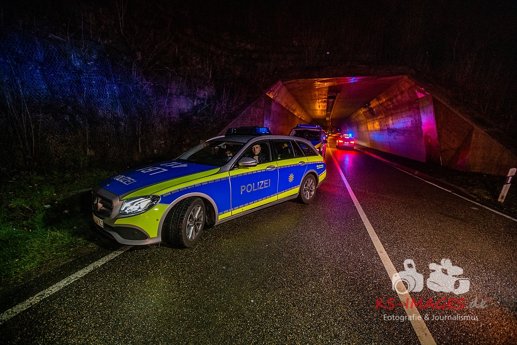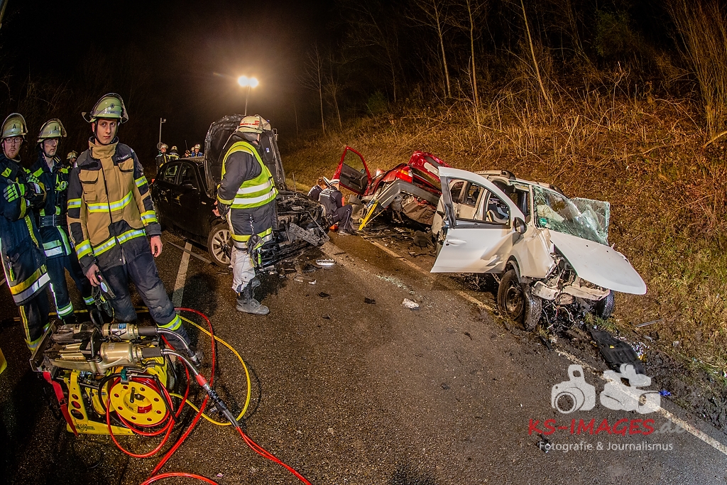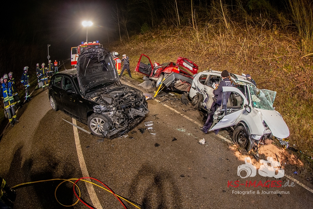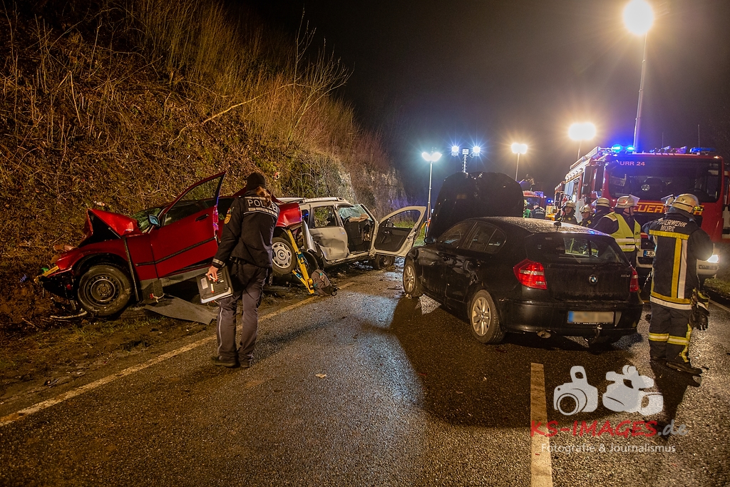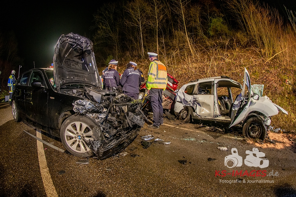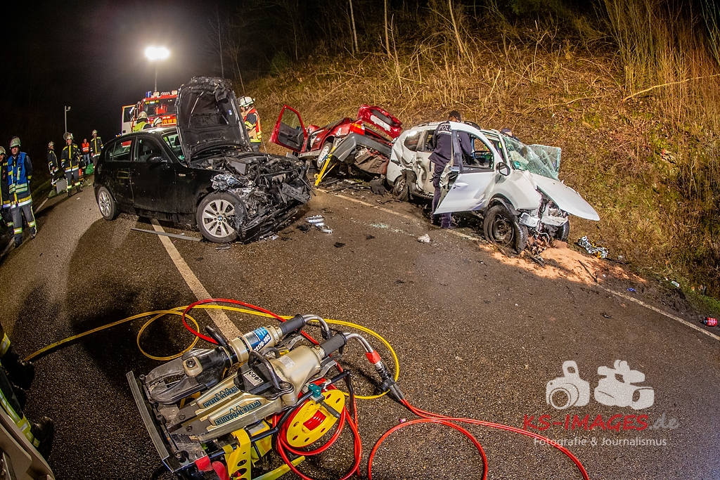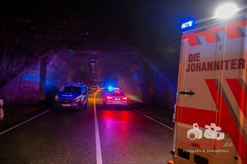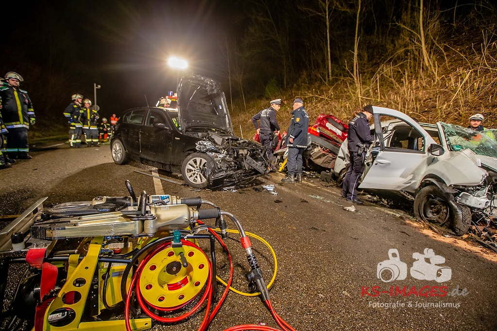 Unmittelbar vor dem Steinbruchtunnel kollidierte der BMW mit einem entgegenkommenden Pkw Dacia Duster einer 46-Jährigen. Beide Fahrzeuge kamen durch die Wucht des Aufpralls ins Schleudern, wobei ein dem Dacia unmittelbar folgender 1er BMW einer 71-Jährigen auf den sich drehenden Dacia auffuhr. Die im 3er BMW eingeklemmte Beifahrerin erlag noch an der Unfallstelle ihren schweren Verletzungen und musste von der Feuerwehr aus dem Fahrzeugwrack geschnitten werden. Auch die Fahrerin des Dacia wurde in ihrem Pkw eigeklemmt. Sie, die ebenfalls schwer verletzte Fahrerin des 3er BMW sowie die leichtverletzte Fahrerin im 1er BMW wurden vom Rettungsdienst in umliegende Krankenhäuser verbracht. Alle drei beteiligten Fahrzeuge waren nicht mehr fahrbereit und mussten abgeschleppt werden. Der entstandene Sachschaden beläuft sich auf ca. 26.000EUR.