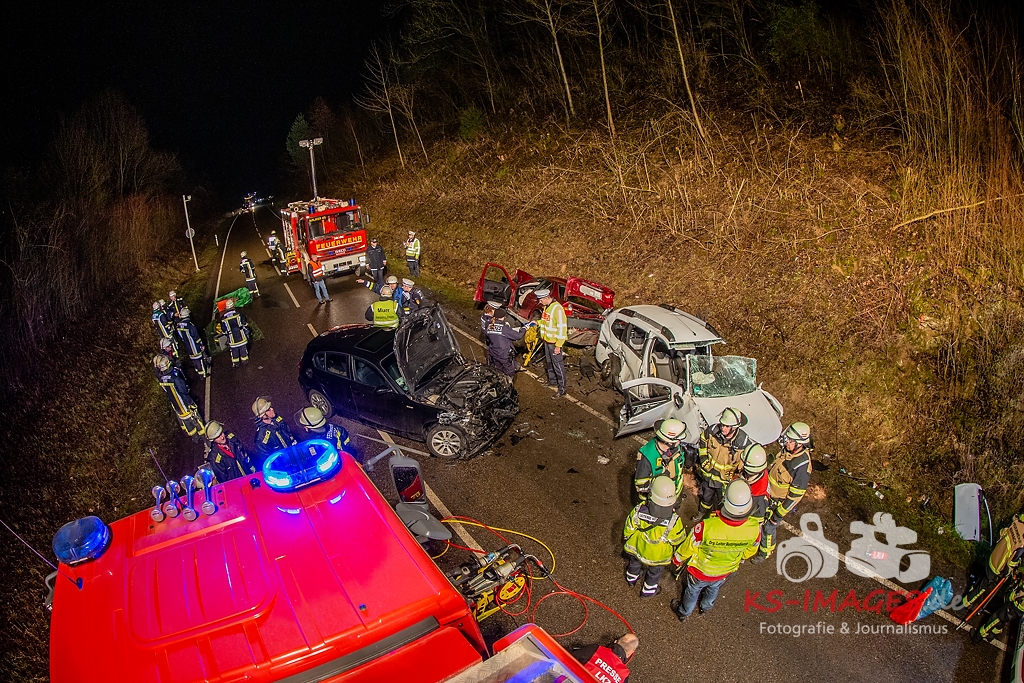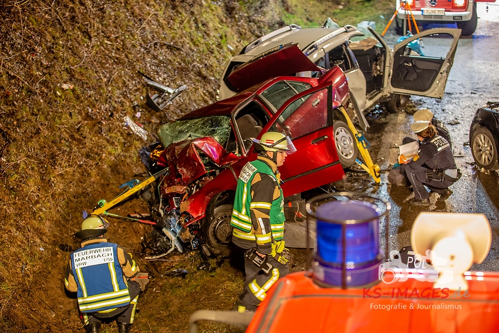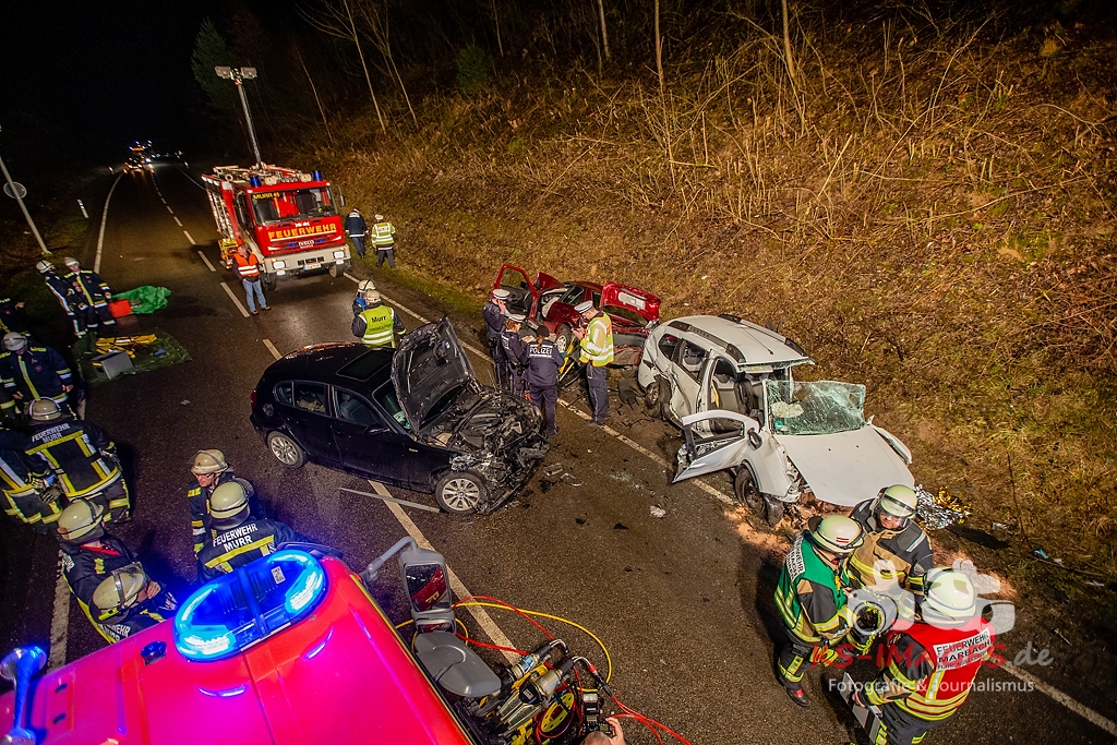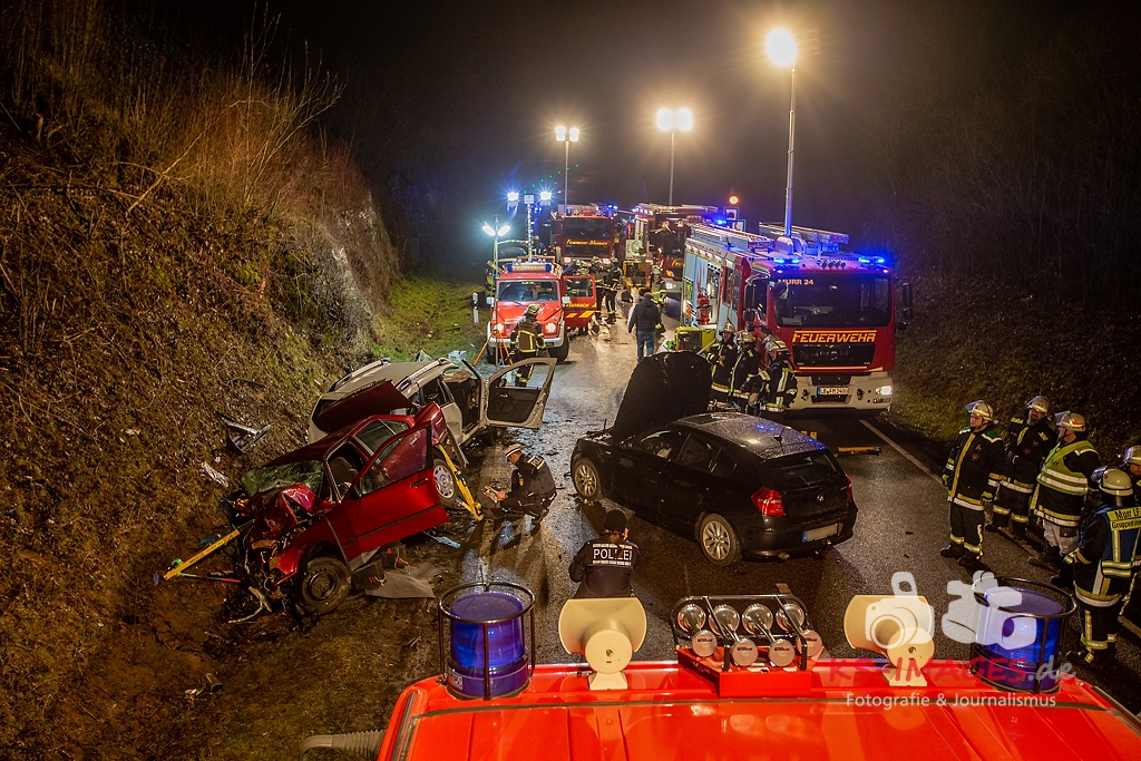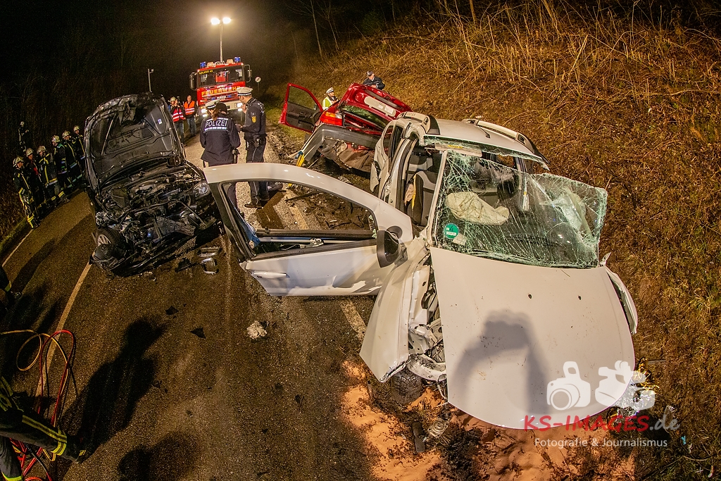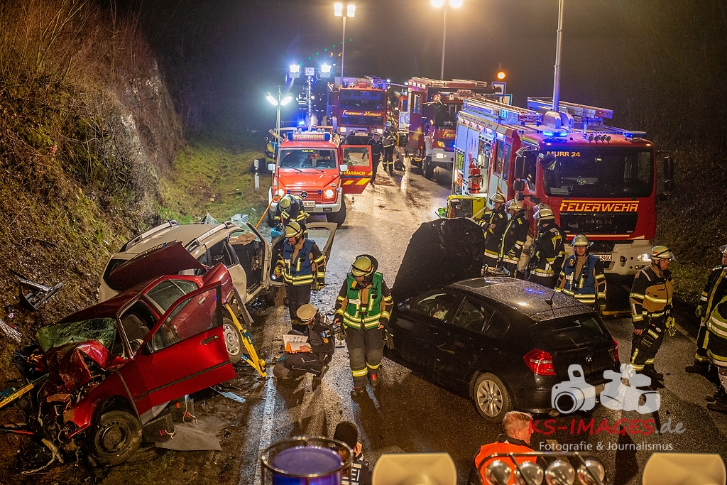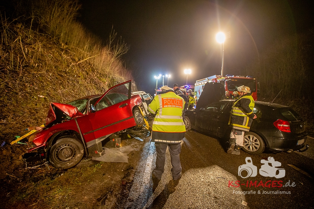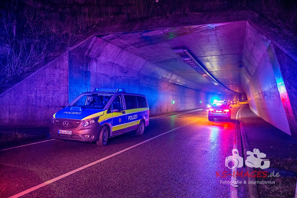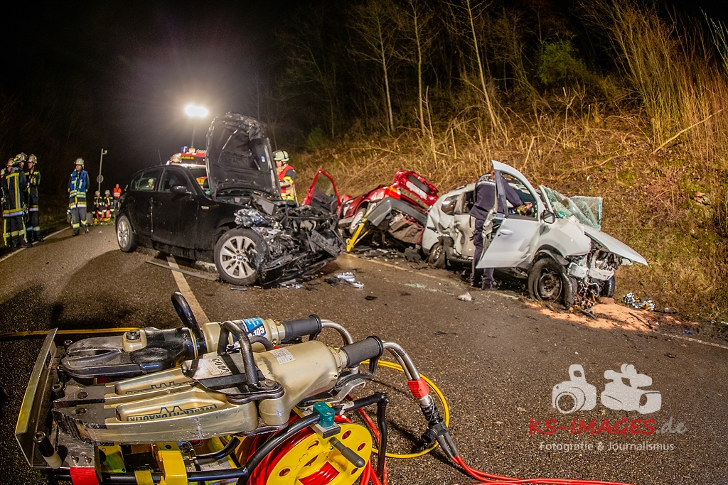 Unmittelbar vor dem Steinbruchtunnel kollidierte der BMW mit einem entgegenkommenden Pkw Dacia Duster einer 46-Jährigen. Beide Fahrzeuge kamen durch die Wucht des Aufpralls ins Schleudern, wobei ein dem Dacia unmittelbar folgender 1er BMW einer 71-Jährigen auf den sich drehenden Dacia auffuhr. Die im 3er BMW eingeklemmte Beifahrerin erlag noch an der Unfallstelle ihren schweren Verletzungen und musste von der Feuerwehr aus dem Fahrzeugwrack geschnitten werden. Auch die Fahrerin des Dacia wurde in ihrem Pkw eigeklemmt. Sie, die ebenfalls schwer verletzte Fahrerin des 3er BMW sowie die leichtverletzte Fahrerin im 1er BMW wurden vom Rettungsdienst in umliegende Krankenhäuser verbracht. Alle drei beteiligten Fahrzeuge waren nicht mehr fahrbereit und mussten abgeschleppt werden. Der entstandene Sachschaden beläuft sich auf ca. 26.000EUR.