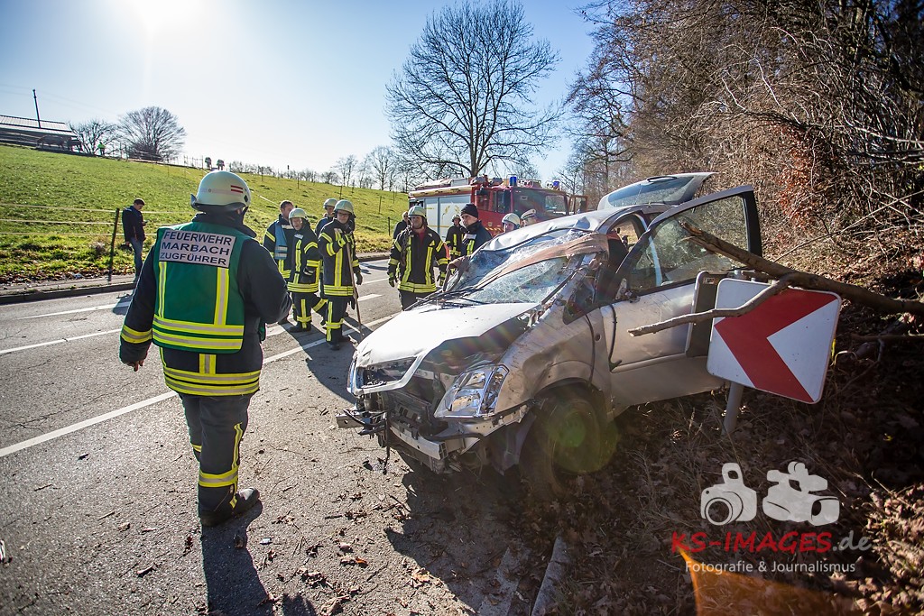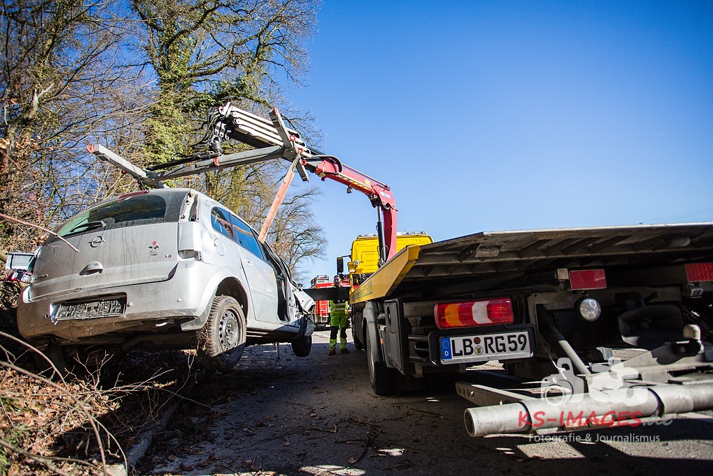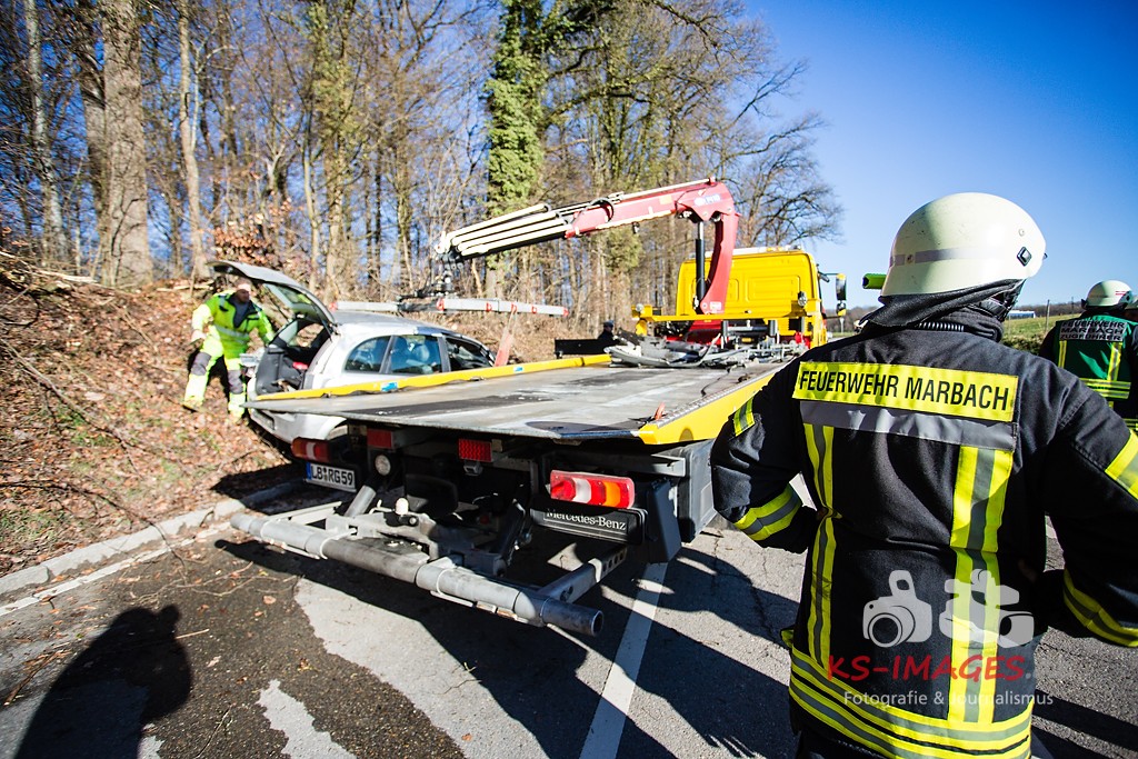 MARBACH: Ein Rentner ist gestern um 10.50 Uhr von Frühmeßhof kommend kurz vor dem Ortseingang Rielingshausen von der Fahrbahn abgekommen und mit seinem Wagen über eine Böschung in den Wald gefahren. Dort fuhr er mehrere Sträucher und kleine Bäume um. Bevor er in etwa drei Meter Höhe stehen blieb, drehte sich sein Wagen um 180 Grad. Die Feuerwehren Marbach mit der Abteilung Rielingshausen mussten anschließend den leicht verletzten Fahrer mit der Drehleiter retten. Warum der 83-Jährige an der Einmündung zur Kreisstraße 1607 nach rechts von der Fahrbahn abkam, ist laut Polizeiangaben noch unklar. Die Beamten geben den Schaden an dem Opel mit 5000 Euro an. An den Bäumen sind 1000 Euro Schaden vermeldet worden. Während der Bergung musste die Straße bis gegen 12.30 Uhr gesperrt werden, zu größeren Behinderungen kam es laut Polizei aber nicht.