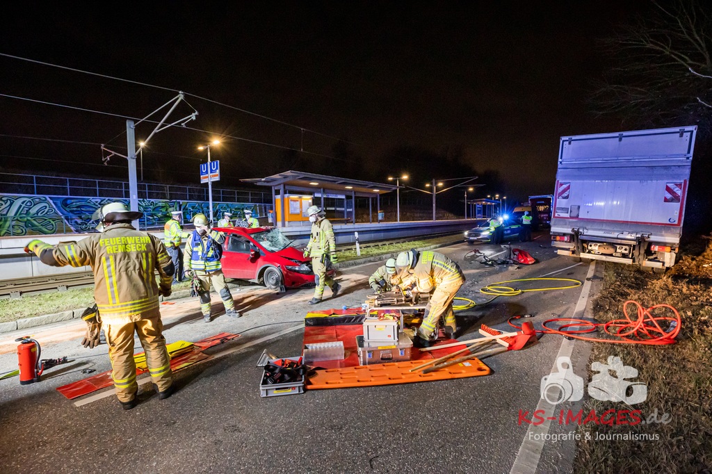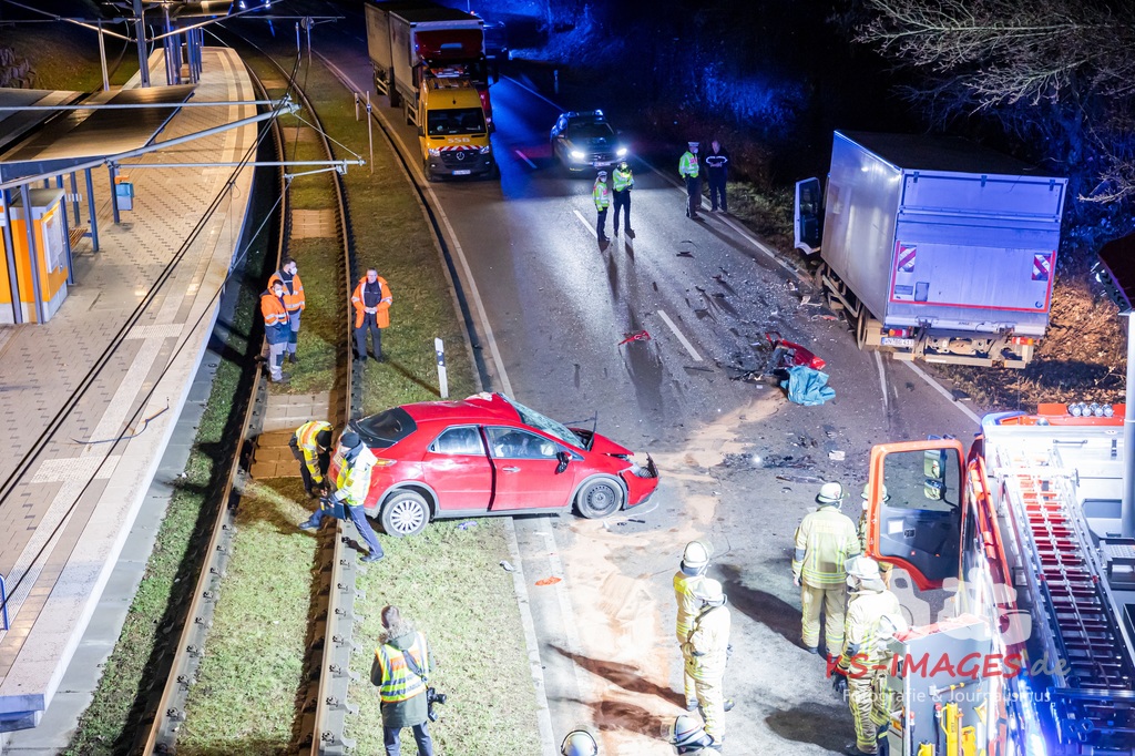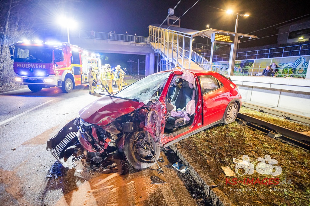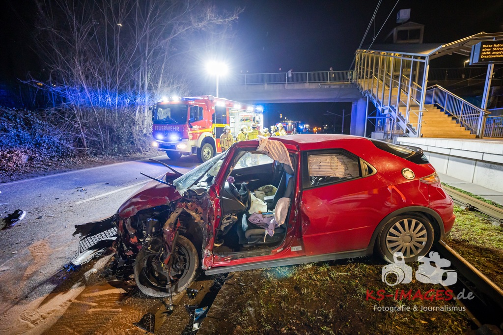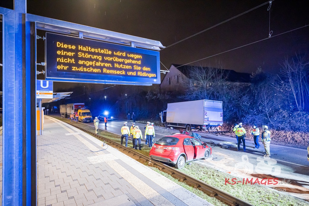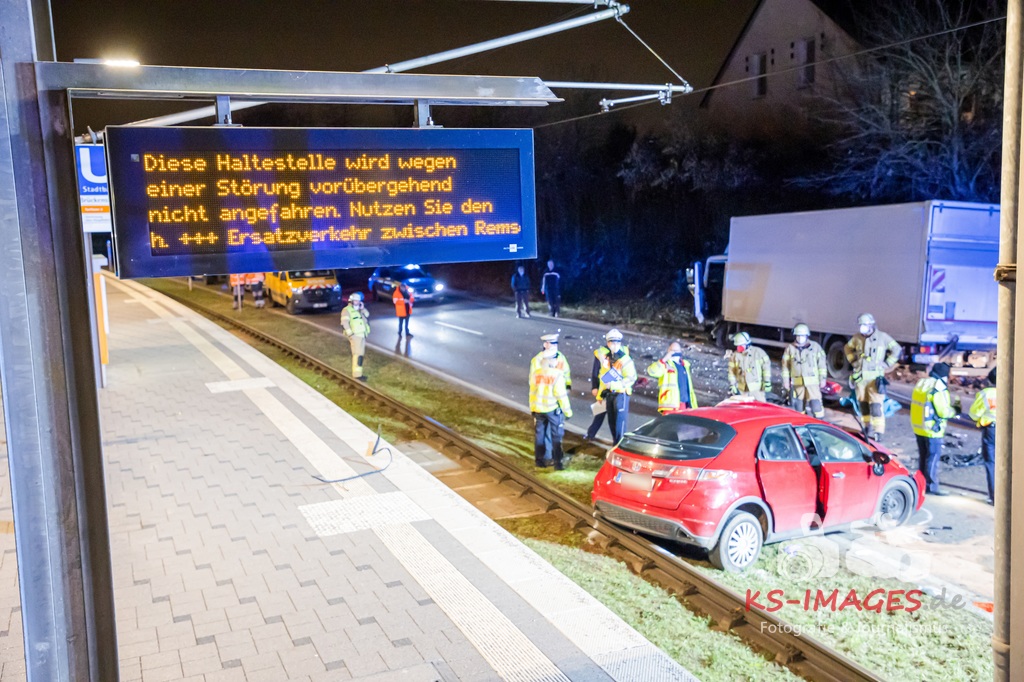 REMSECK / ALDINGEN: Gegen 17.30 Uhr befuhr eine 51-jährige Honda-Fahrerin die Neckartalstraße in Richtung Neckargröningen und kam kurz vor der Schleuse Aldingen aus noch ungeklärter Ursache in den Gegenverkehr. Dort stieß sie frontal mit einem entgegenkommenden Lkw der Marke MAN eines 43-Jährigen zusammen. Durch den Aufprall wurde der Honda Civic über die Fahrbahn geschleudert und kam auf den Gleisen der U-Bahn zum Stehen.