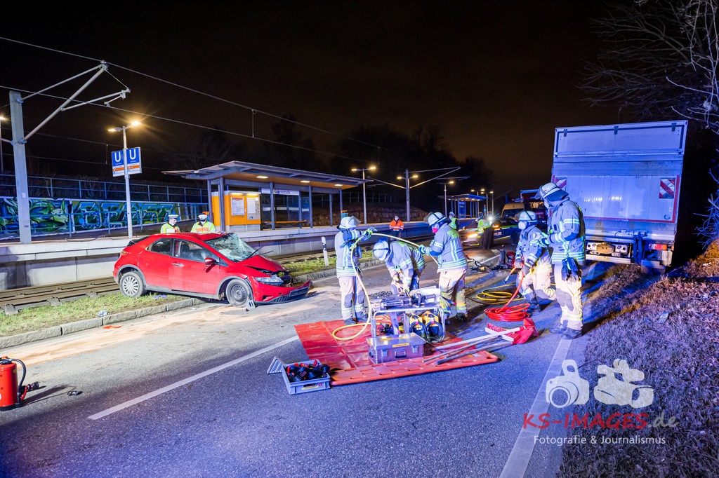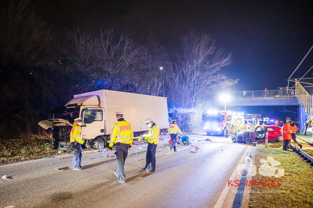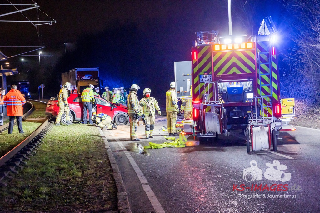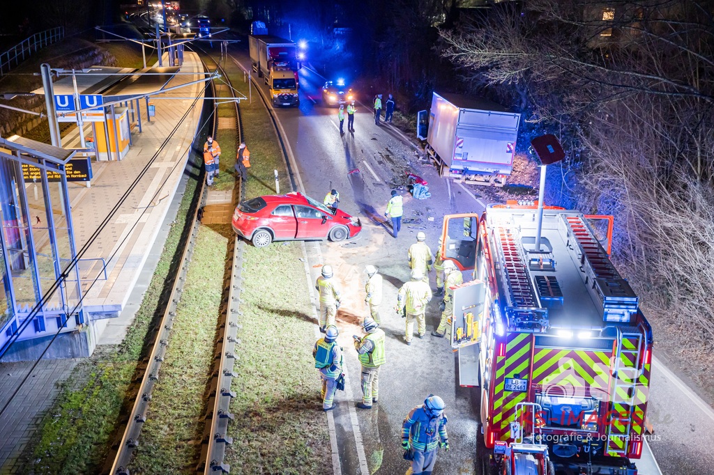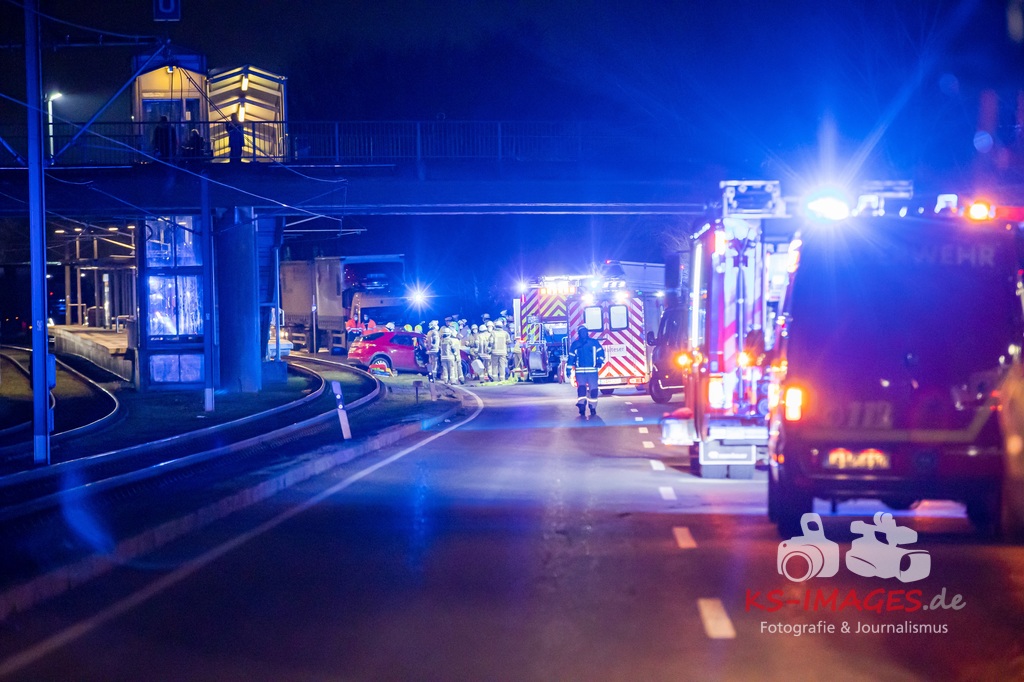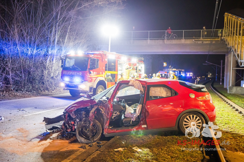 REMSECK / ALDINGEN: Gegen 17.30 Uhr befuhr eine 51-jährige Honda-Fahrerin die Neckartalstraße in Richtung Neckargröningen und kam kurz vor der Schleuse Aldingen aus noch ungeklärter Ursache in den Gegenverkehr. Dort stieß sie frontal mit einem entgegenkommenden Lkw der Marke MAN eines 43-Jährigen zusammen. Durch den Aufprall wurde der Honda Civic über die Fahrbahn geschleudert und kam auf den Gleisen der U-Bahn zum Stehen.