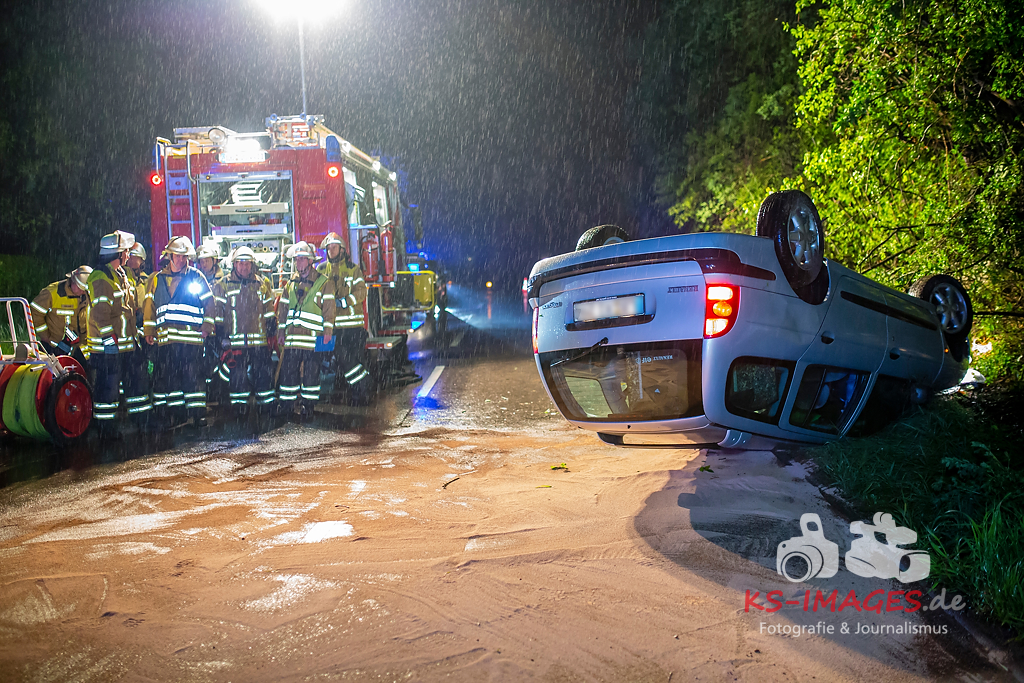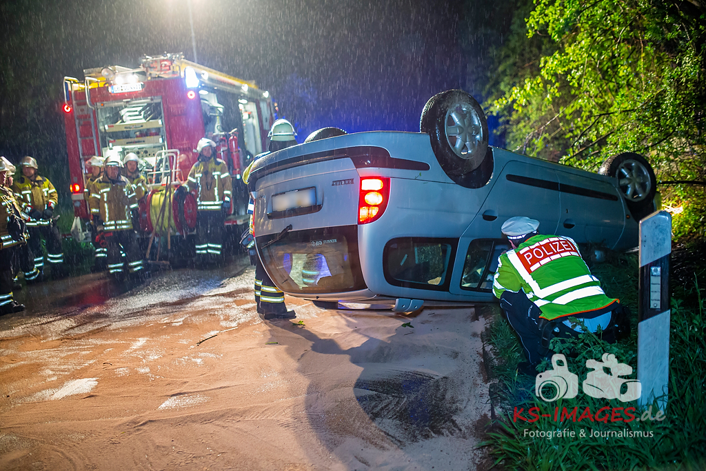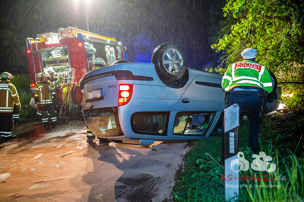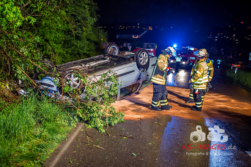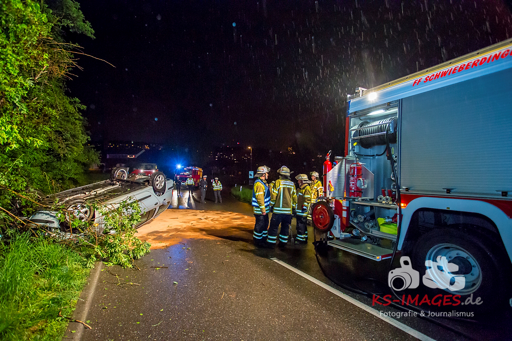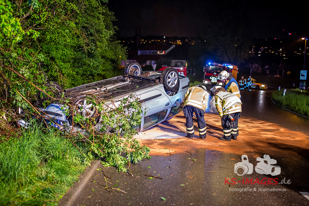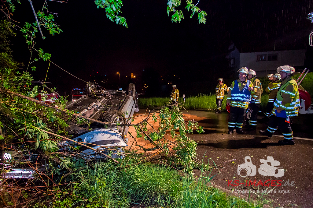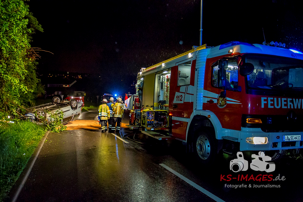 SCHWIEBERDINGEN: Am Freitag um 21:45 Uhr befuhr ein 45jähriger Fahrzeuglenker mit seinem Pkw Renault die Hemminger Straße ortsauswärts in Richtung Hemmingen. Im Verlauf einer Linkskurve kam er auf regennasser Fahrbahn offenbar aufgrund unangepasster Geschwindigkeit nach rechts von der Fahrbahn ab, überfuhr mehrere Leitpfosten und Warnbaken, kollidierte mit einem Baum und überschlug sich letztendlich an einer Böschung. Ersthelfer vor Ort befreiten den leicht verletzten Fahrzeuglenker aus dem auf dem Dach liegenden Pkw. Er wurde im weiteren Verlauf vom Rettungsdienst zur ambulanten Behandlung in das Krankenhaus Ludwigsburg verbracht. Bei der Unfallaufnahme konnte beim Fahrzeuglenker Atemalkoholgeruch festgestellt werden. Ein entsprechender Alkoholvortest bestätigte den Verdacht. Eine Blutentnahme wurde durchgeführt. Am Pkw entstand Totalschaden in Höhe von 2000 Euro. Der Sachschaden an den Verkehrszeichen und am Baum wird auf insgesamt 400 Euro geschätzt. Aufgrund ausgelaufener Betriebsstoffe und Absperrmaßnahmen war die freiwillige Feuerwehr Schwieberdingen mit insgesamt 4 Fahrzeugen und 27 Einsatzkräften vor Ort.