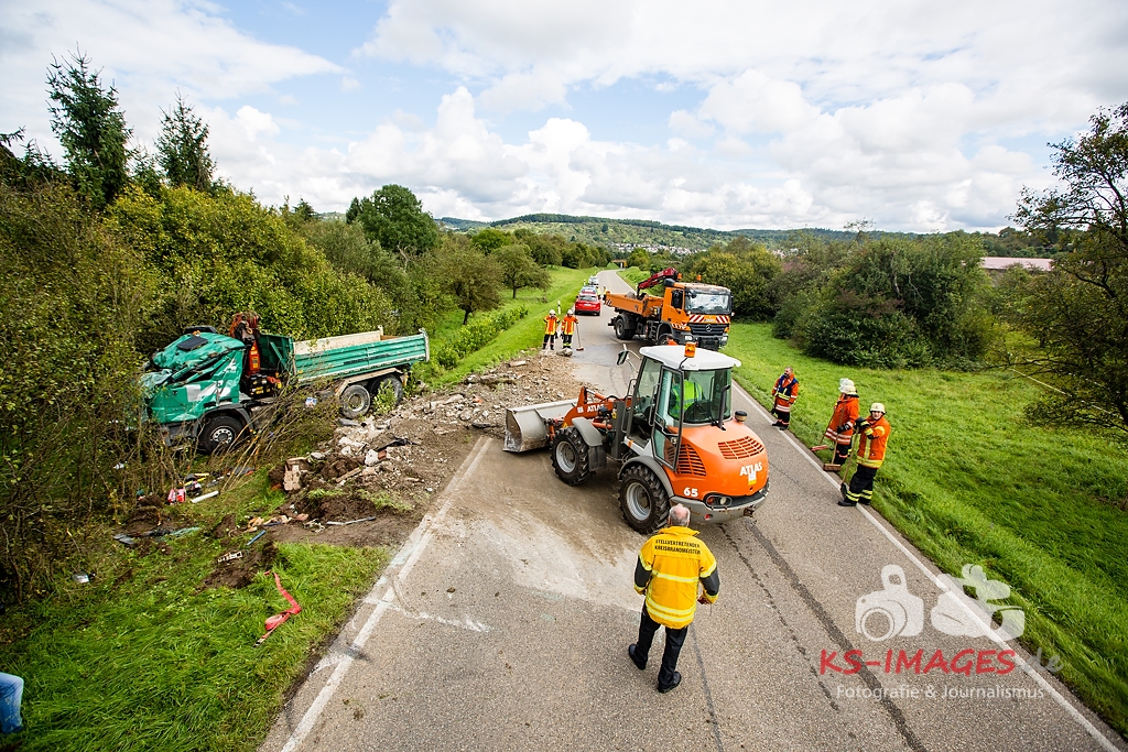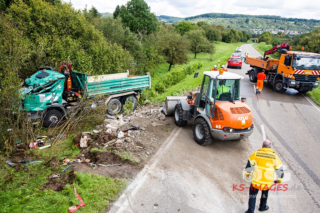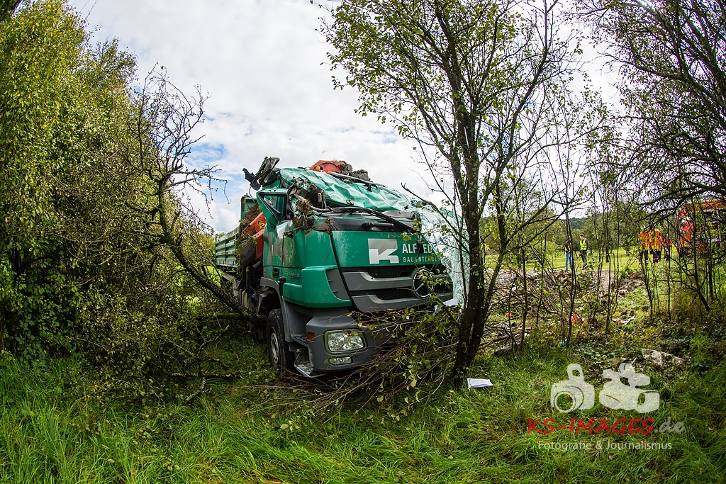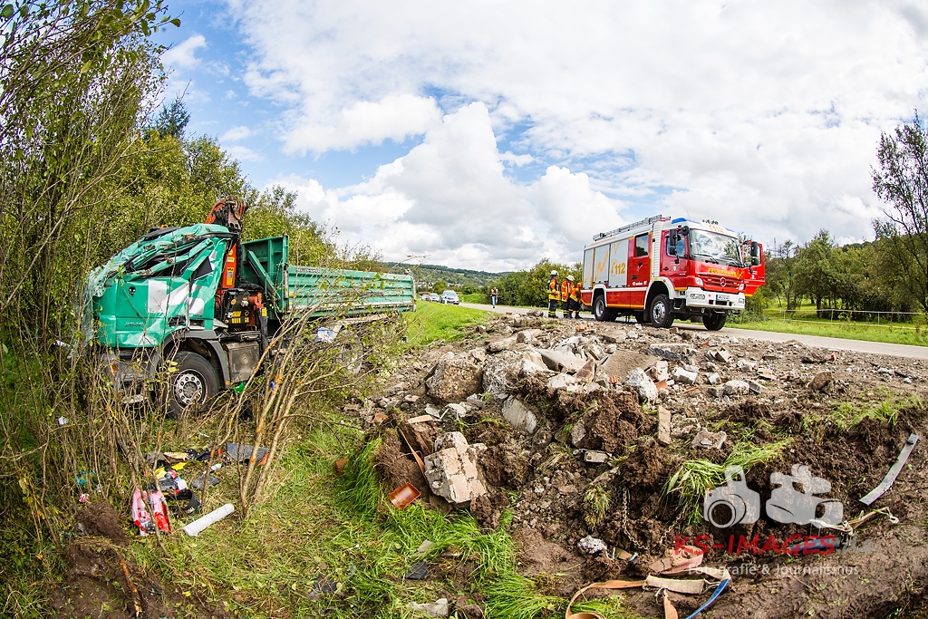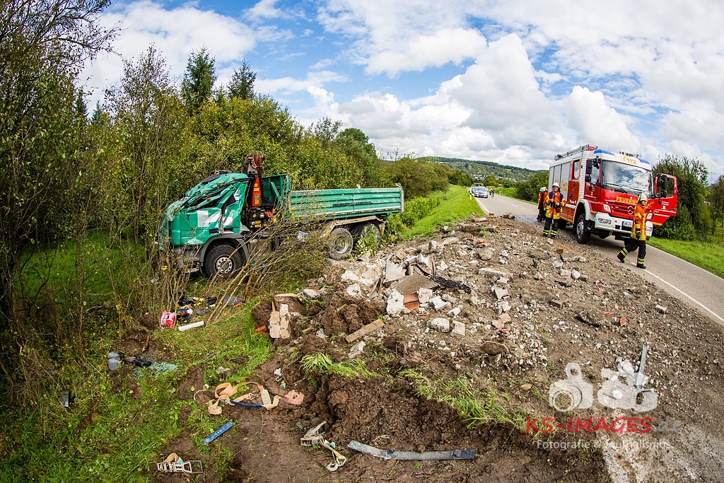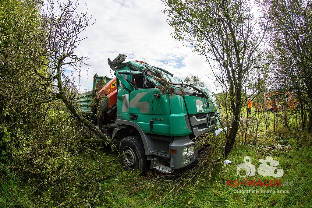 Fotostrecke: Fahrer eines LKW verlor alkoholisiert die Kontrolle – LKW überschlägt sich Fahrer von Feuerwehr befreit – L1140 Winnenden 18.09.2017