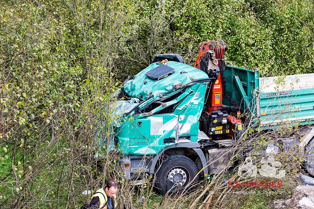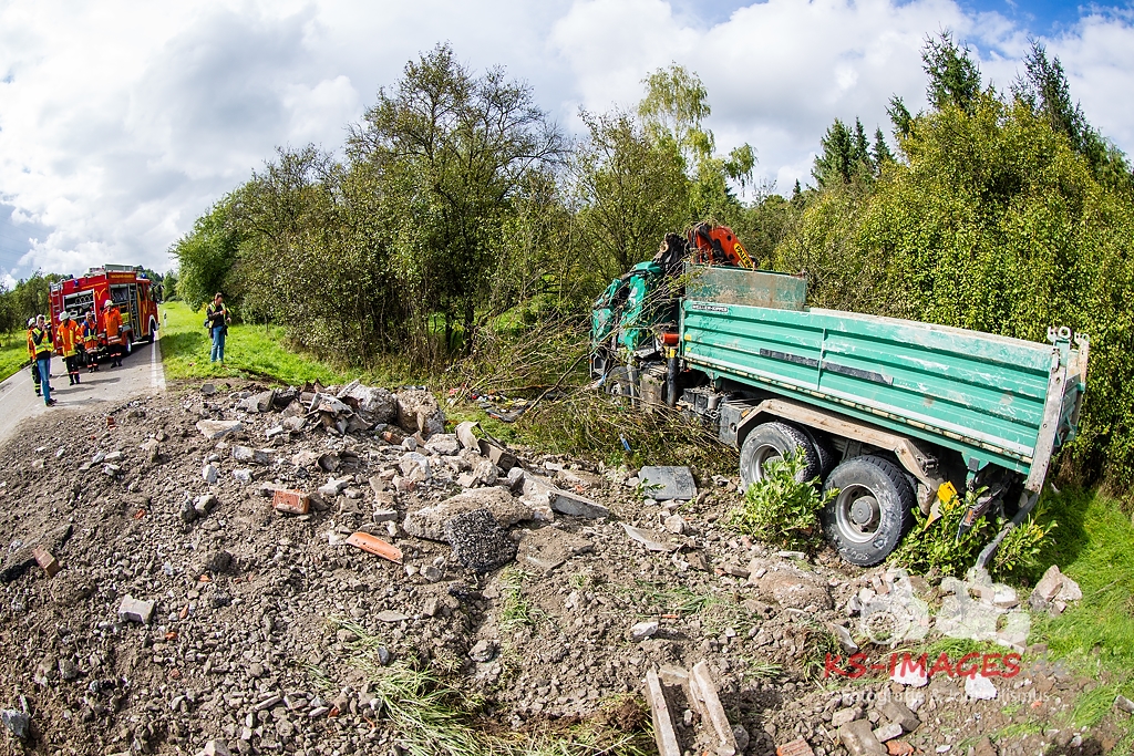Kipplaster mit Bauschutt überschlägt sich - Feuerwehr muss verletzten Fahrer befreien