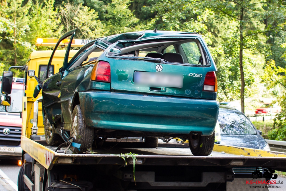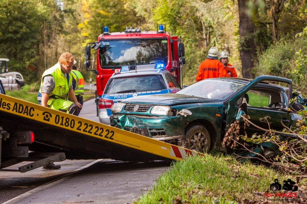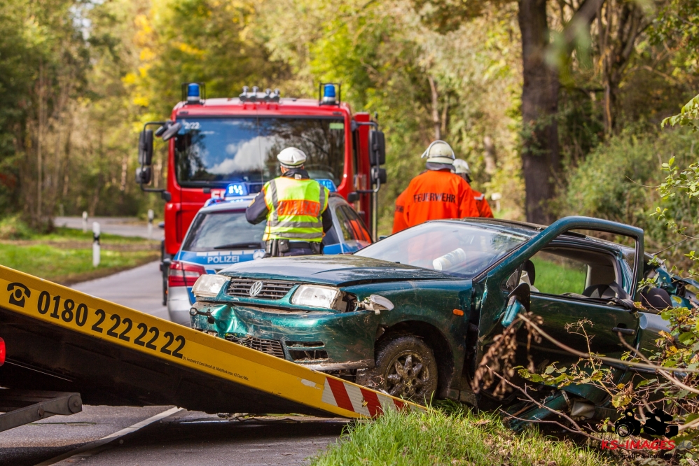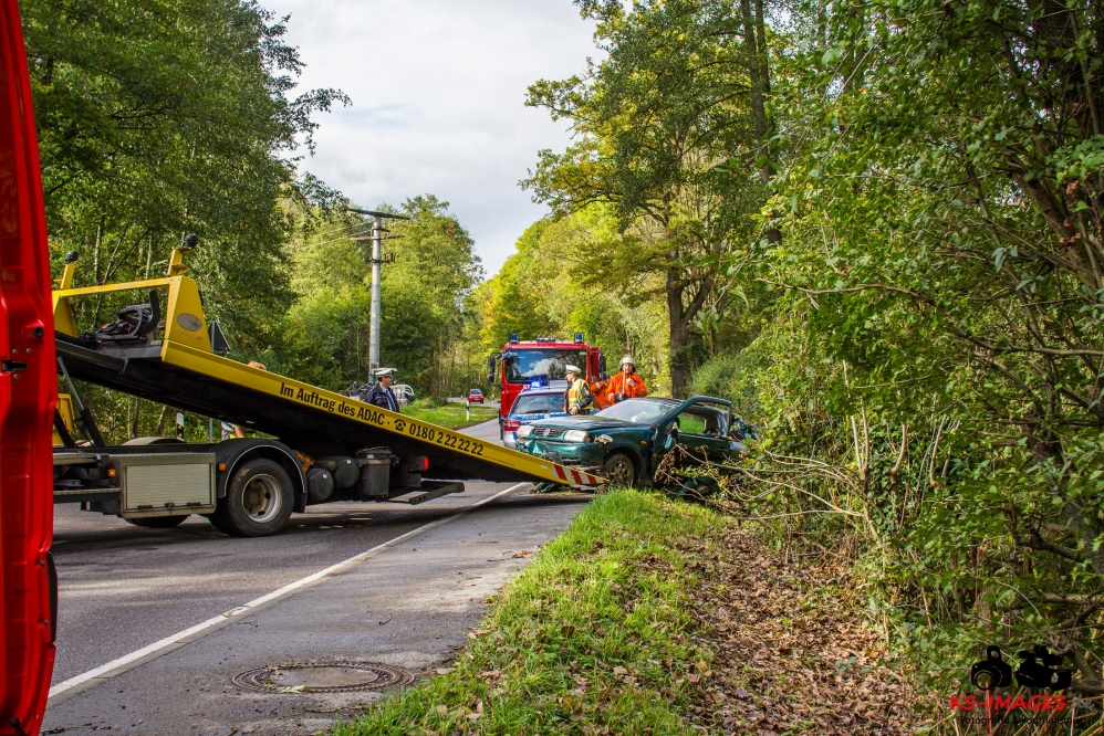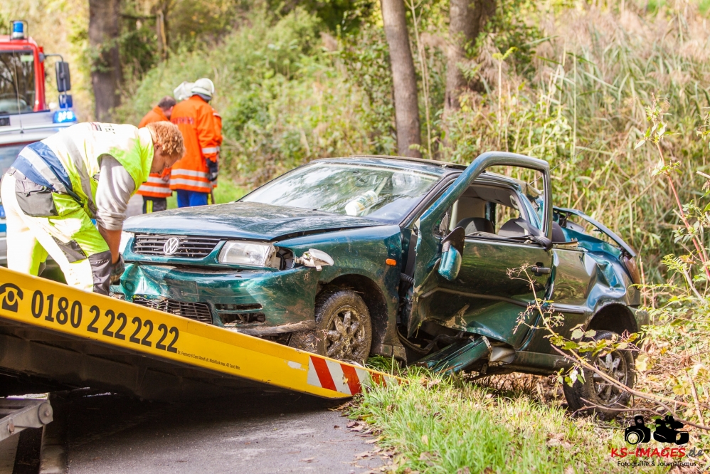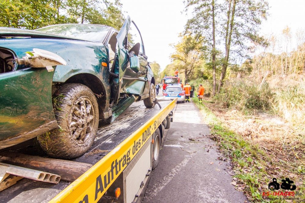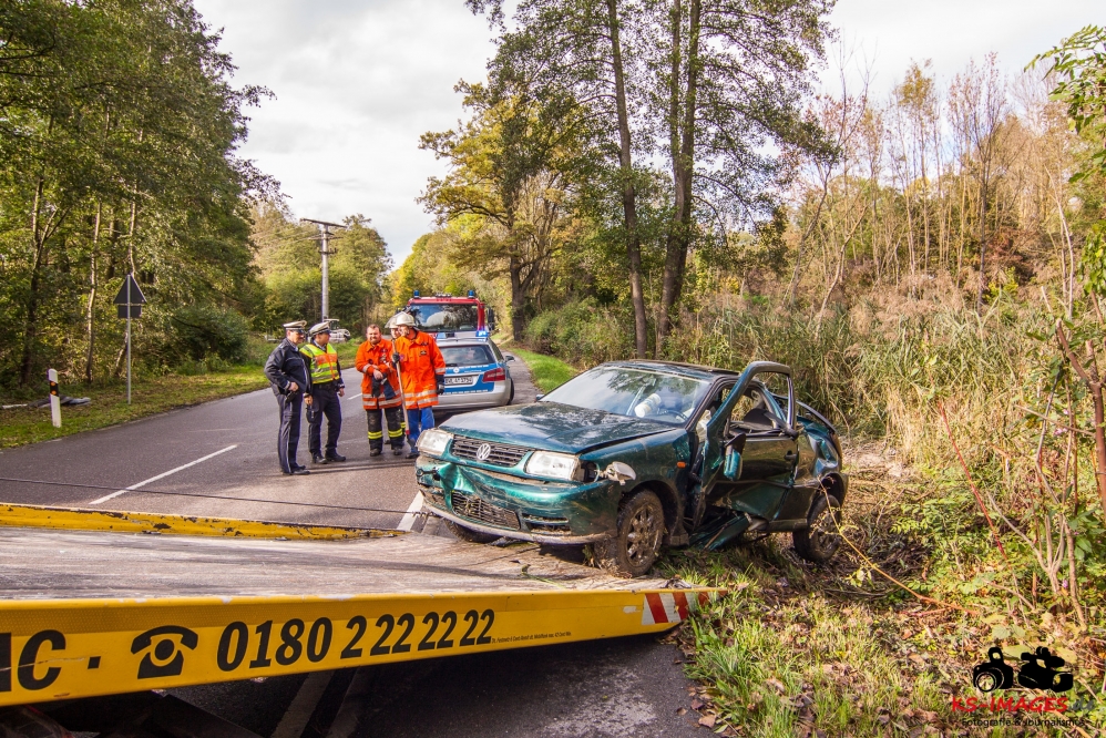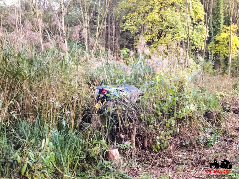 Verkehrsunfall Steinheim Kleinbottwar 11.10.2013_ 0003Am Freitag war ein 27 Jahre alter Fahrer eines VW Polo, gegen 15:05 Uhr, auf der Kreisstraße 1702 in Richtung Kleinbottwar unterwegs. In einer Linkskurve kam der 27-Jährige vermutlich infolge Unachtsamkeit nach rechts von der Fahrbahn ab, wobei der Polo in einem angrenzenden Graben auf der Seite zum Liegen kam. Der Fahrer zog sich dabei schwere Verletzungen zu. Er wurde vom Rettungsdienst, der mit einem Notarzt sowie einem Rettungsfahrzeug im Einsatz war, in ein Krankenhaus gebracht. Zur Bergung des Fahrzeugs war die Feuerwehr Steinheim mit zwei Fahrzeugen an der Unfallstelle. Da Betriebsflüssigkeiten aus dem Fahrzeug ausgelaufen waren, musste das Erdreich an der Unfallstelle von einer Spezialfirma abgetragen werden. Der Gesamtschaden beläuft sich auf rund 5.000 Euro.