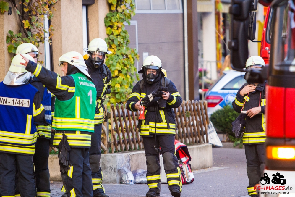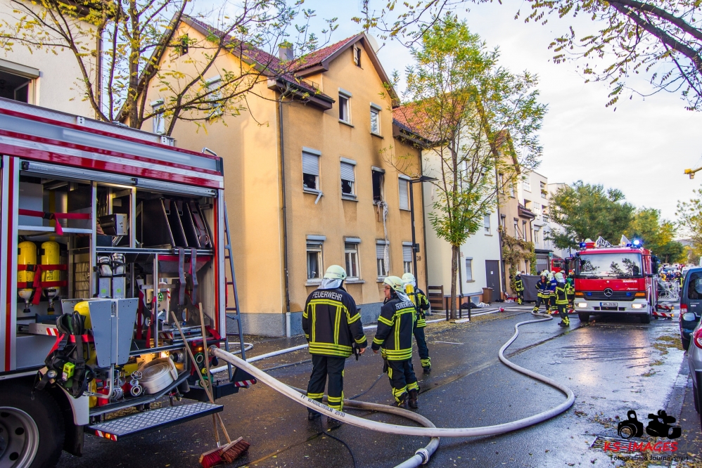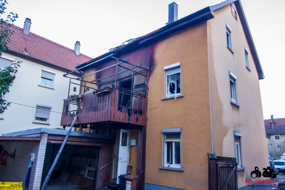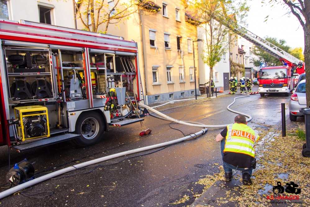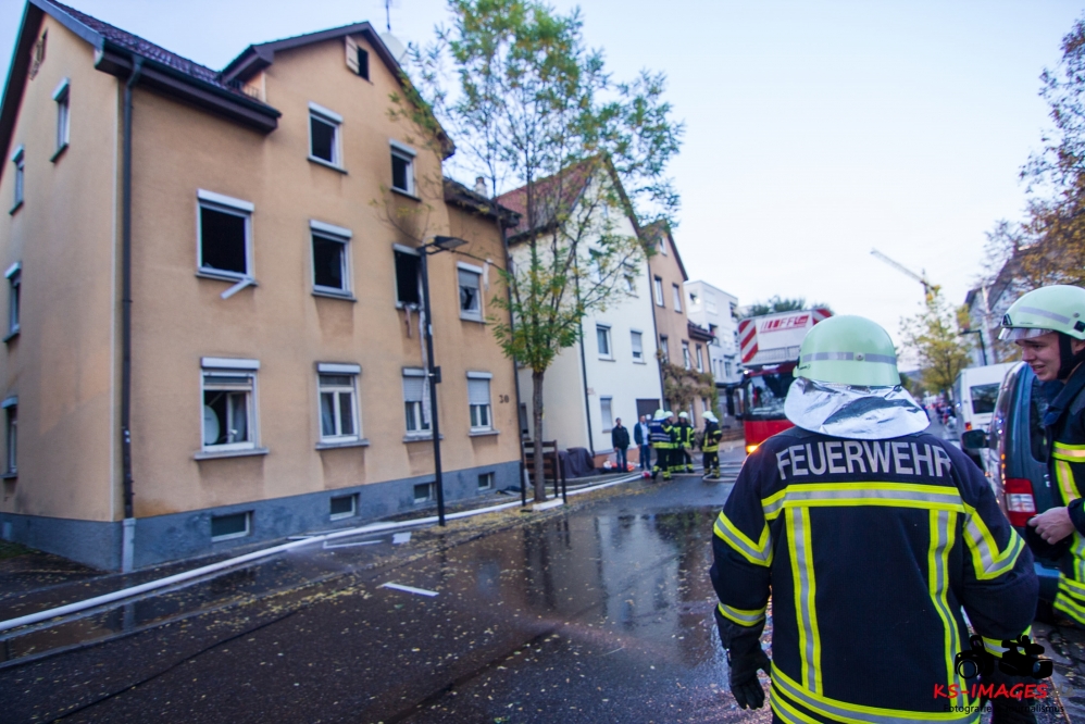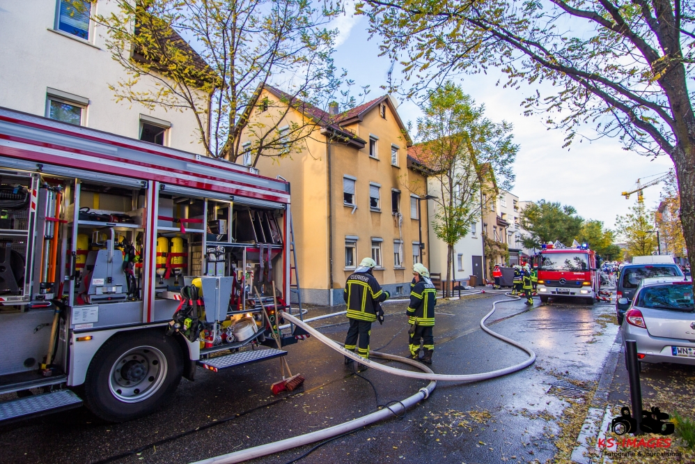 Ein Toter, eine lebensgefährlich Verletzte und ein Schwerverletzter wurden Opfer eines Wohnhausbrandes in der Waiblinger Fronackerstraße am späten Dienstagnachmittag. Kurz vor Toedlicher Brand Waiblingen 22.10.2013_ 000817:00 Uhr vernahmen Anwohner mehrere laute Knallgeräusche und anschließend einen Brand im ersten Stock eines Mehrfamilienhauses am Rande der Waiblinger Innenstadt. Mit dem Brand ging eine Verpuffung oder gar eine Explosion einher. In der Wohnung im ersten Stock zerbarsten Scheiben, Rollladenteile und Glasscherben flogen bis zu 20 Meter weit und beschädigten Fahrzeuge. Im Zuge der sofort eingeleiteten Lösch- und Rettungsmaßnahmen der Waiblinger Feuerwehr konnten zwei Personen aus dem Haus geborgen werden. Es handelte sich um einen Mann, der nur noch tot aufgefunden werden konnte, und eine Frau, die mit lebensgefährlichen Verletzungen in eine Spezialklinik eingeliefert wurde. Die Identität beider Personen steht derzeit noch nicht fest. Möglicherweise handelt es sich um Bewohner des Hauses. Ein 80-jähriger Hausbewohner erlitt eine Herzattacke und musste ebenfalls stationär ins Krankenhaus gebracht werden. Weitere Hausbewohner konnten sich selbst retten oder befanden sich zum Brandausbruch nicht in der Wohnung. Die Bewohner sind allesamt bei Bekannten oder Verwandten untergekommen. Insgesamt sind 10 Personen in dem Haus gemeldet. Ob Besucher zum Zeitpunkt des Brandausbruches ebenfalls im Haus waren ist nicht bekannt.