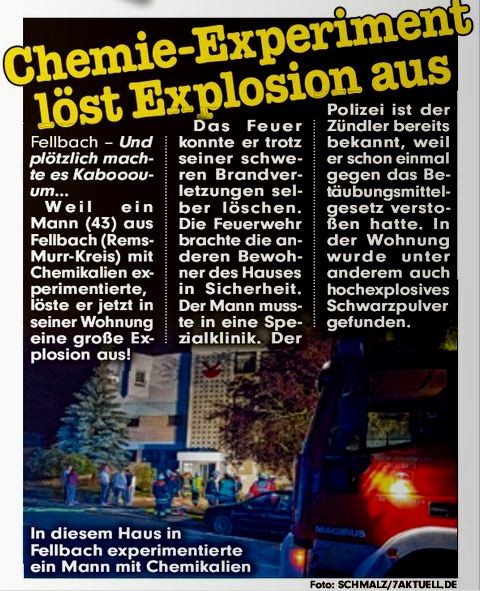 Fellbach: Am Mittwochabend kam es kurz nach 22.30 Uhr zu einer Verpuffung in einer Einraumwohnung im Untergeschoss eines Mehrfamilienhauses in der Porschestraße. Der 43-jährige Bewohner dieser Wohnung wurde hierdurch schwer aber nicht lebensgefährlich verletzt. Er zog sich unter anderem schwere Brandwunden zu und wurde in eine Klinik eingeliefert. Durch das Ereignis entstand ein kleinerer Brand in der Wohnung, welcher von dem 43-Jährigen selbst gelöscht werden konnte. Das Schadensausmaß konnte in der Nacht noch nicht abgeschätzt werden, dürfte ersten Schätzungen nach aber eher gering sein. In der Wohnung konnten zahlreiche und noch nicht näher bestimmbare Chemikalien und Substanzen, vermutlich unter anderem auch Schwarzpulver, vorgefunden werden. Möglicherweise führte eine Handhabung mit diesen zu dem Ereignis. In dem vierstöckigen Gebäude befanden sich zum Zeitpunkt fünf weitere Personen, die allesamt unverletzt blieben und ihre Wohnungen vorübergehend verließen.In der Nacht waren die Feuerwehren aus Fellbach sowie Fellbach-Oeffingen mit insgesamt 50 Mann im Einsatz. Weiterhin befanden sich neben Rettungskräften zwei Streifenbesatzungen des Polizeireviers Fellbach sowie zwei Delaborierer des Landeskriminalamts vor Ort. Der Kriminaldauerdienst hat noch in der Nacht Ermittlungen aufgenommen, die heute von der Kriminalpolizei Waiblingen fortgeführt werden.